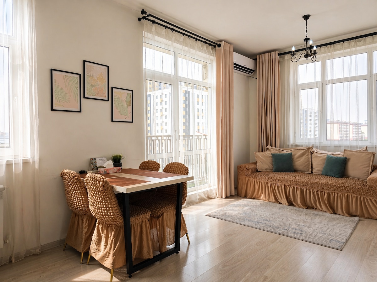 Абсолютно новые и уютные аппартаменты, для спокойного отдыха. Находится в центре Ташкента, недалеко от международного аэропорта. Самый востребованный район для иностранных гостей, так как в шаговой доступности имеются много ресторанов с различными национальным кухнями. Много мест для развлечения, рынки и прогулочные зоны, парки и т.д. В квартире имеется все необходимое, для комфортного проживания. Имеется спальня с двухместной кроватью и раскладной диван (полноценный двухместный).