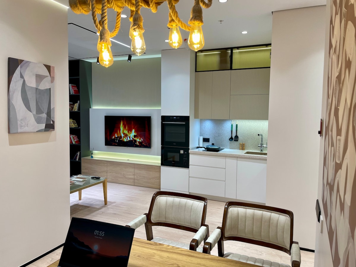 En moderne og lys leilighet med to soverom i det prestisjetunge boligkomplekset NRG U Tower, som ligger i ellevte etasje med en fantastisk panoramautsikt over byen. Leilighetene er fullt utstyrt for et komfortabelt opphold: designerinteriør, smart-TV, raskt trådløst nettverk, klimaanlegg, vaskemaskin og et fullt utstyrt kjøkken. Vi har et bonusprogram for gjestene våre – 10 % cashback gis for gjentatte bestillinger og anbefalinger. Innsjekking døgnet rundt er mulig etter avtale🤝✅