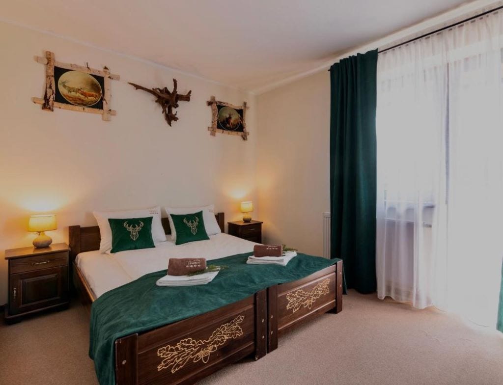 Deluxe dobbeltrom med balkong nr. 1 – et elegant rom i høylandsstil. Det varme interiøret, med de anvendte tilbehørene, gjenspeiler naturens skjønnhet og innbyggerne i Tatra nasjonalpark. Villaen ligger i kort avstand til de viktigste attraksjonene i Zakopane – eiendommen vår ligger bare 1,6 km fra pittoreske Krupówki, og vi ligger 15 minutters gange fra Zakopane togstasjon.
