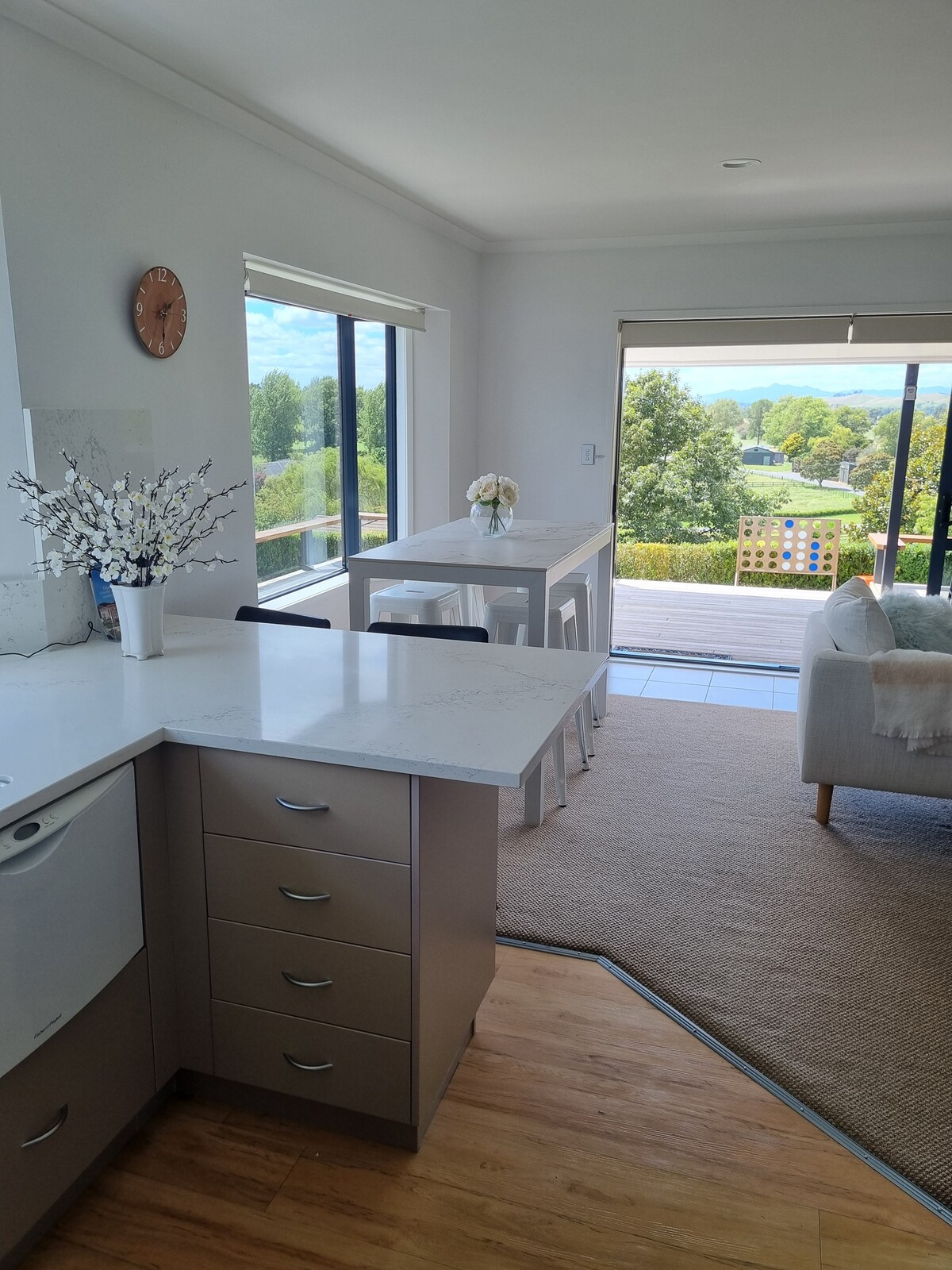 Kowhai House har en unik beliggenhet på toppen av en bløff som gir uovertruffen utsikt over innfødt busk på tre sider og landlig landbruk på den andre siden. Siden det er et nybygg, har vårt fokus vært på å tilby en elegant, stilig ferie, med alle de moderne bekvemmelighetene, hvis gjestene våre trenger å ta igjen den travle verden utenfor. Sørg for å ta en titt på vårt andre utleiested Tui Lodge og hytte, nylig oppført for å kompliment Kowhai House. Det er ideelt for par eller større grupper (to par som reiser sammen eller en familie).