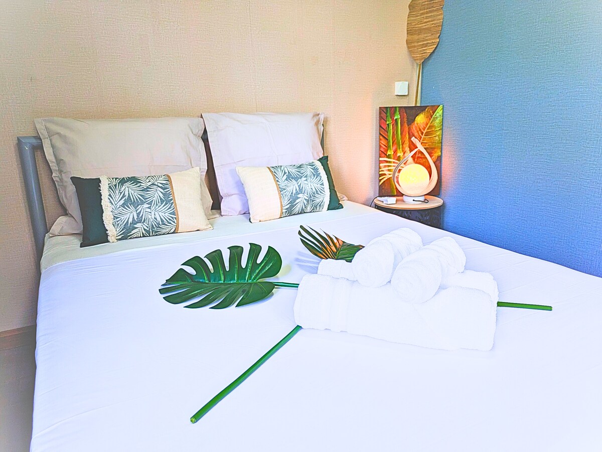 Velkommen, Atiha Blue Lodge har plass til 2 voksne + 1 barn. Hytta har en ideell beliggenhet ved sjøen. Den store terrassen har en fantastisk utsikt over den fredelige Atiha-bukten, og gir direkte tilgang til en liten grå sandstrand: kajakk eller surfing rett overfor. Den har: hovedsoverom med havutsikt, 2. soverom i mesanin, moderne bad, utstyrt kjøkkenkrok, stor terrasse med spisebord, hagemøbler og liggestoler. Kajakk, grill og sykler på forespørsel. Ses snart