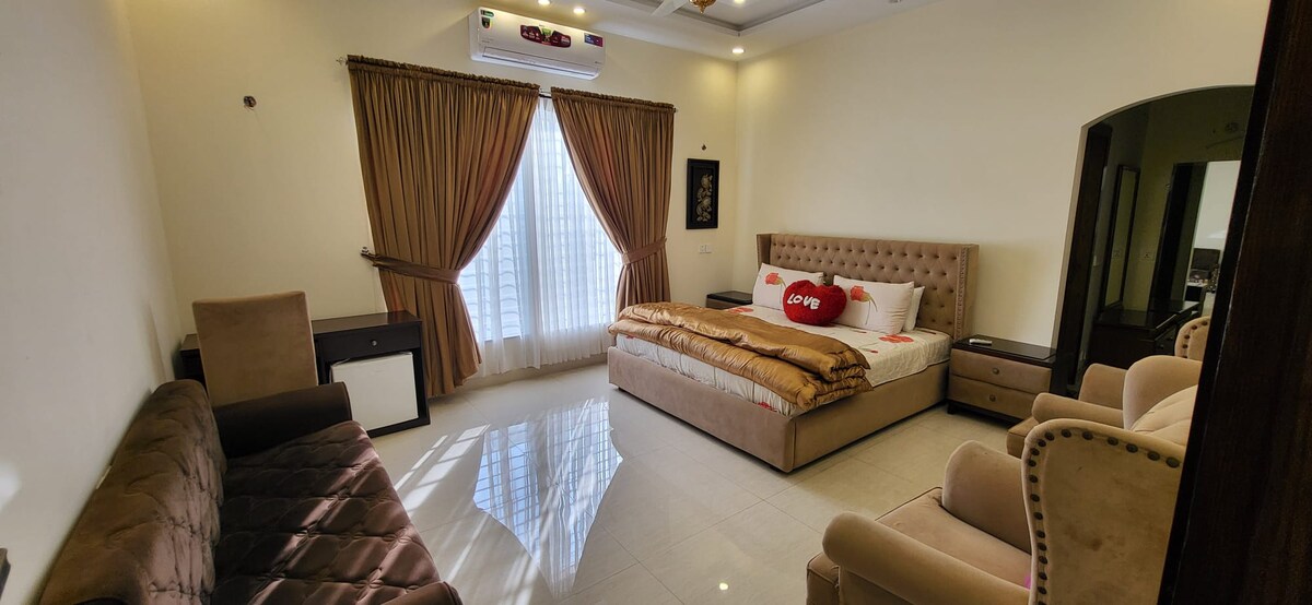 Hjemmet vårt tilbyr en rolig flukt fra byens kjas og mas, samtidig som det er praktisk plassert i DHA Phase 5 Sector F. Enten du besøker Islamabad for forretninger eller fornøyelse, er stedet vårt i DHA det perfekte stedet å kalle hjem. Ta med hele familien til dette flotte stedet med mye plass til moro. Bestill oppholdet ditt i dag og opplev roen selv!