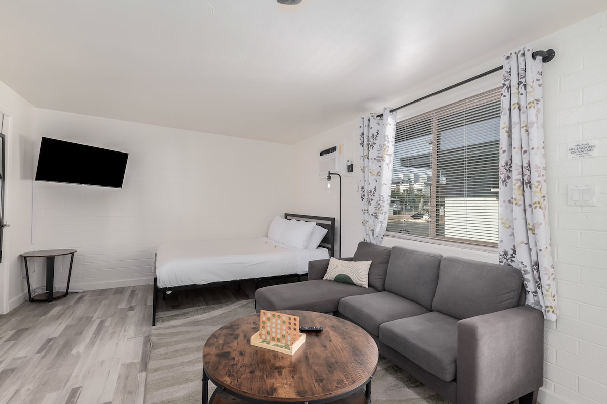 Studio at Maple Ash er ditt private tilfluktssted – det ligger i det ikoniske nabolaget Maple Ash, et av Tempes mest historiske og gangbare distrikter. Perfekt for Spring Training-fans, ASU-besøkende, snøfugler og par. Slapp av i den helt lukkede hagen med bålpanne, sitteplasser og utendørs spiseplass. Gå til ASU, Gammage, Mill Ave, festivaler på Tempe Beach Park og se kamper på Cactus League-stadionene i nærheten. Bare ti minutter til Sky Harbor.
