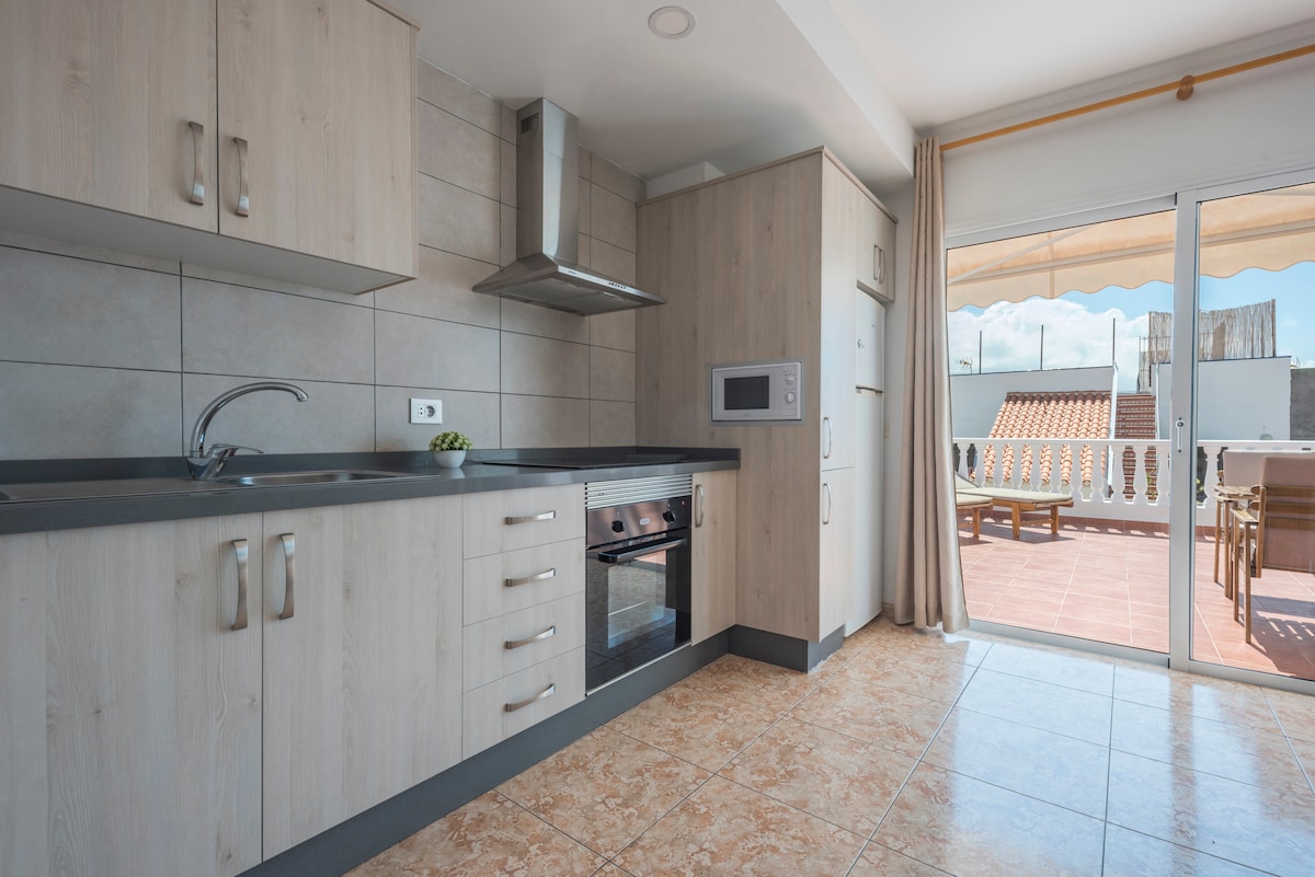 Helt ny (10/2025) to-roms leilighet med klimaanlegg, raskt trådløst nettverk og en privat uteplass — enheten i første etasje i et fullstendig renovert hus i et fredelig nabolag med hvite hus. Bare 5 minutters gange til Playa Amarilla-stranden og 15 minutter fra Tenerife Sør lufthavn. Gratis parkering, tre bassenger og en erfaren Superhost med over 2300 anmeldelser.