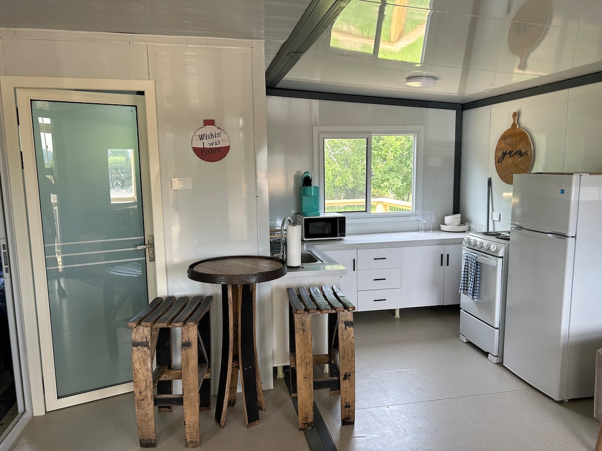 Flykt til et unikt og koselig tilfluktssted i dette stilige huset som ligger ved den rolige elvebredden. På innsiden kommer du til et gjennomtenkt designet sted med elegante, komfortable møbler og vinduer som inviterer skjønnheten til naturen inne. utenfor til de rolige omgivelsene ved elvebredden. Enten du drikker kaffe på dekk eller fisker ved siden av, vil dette containerhuset tilby både en fredelig utflukt og en base for eventyr.