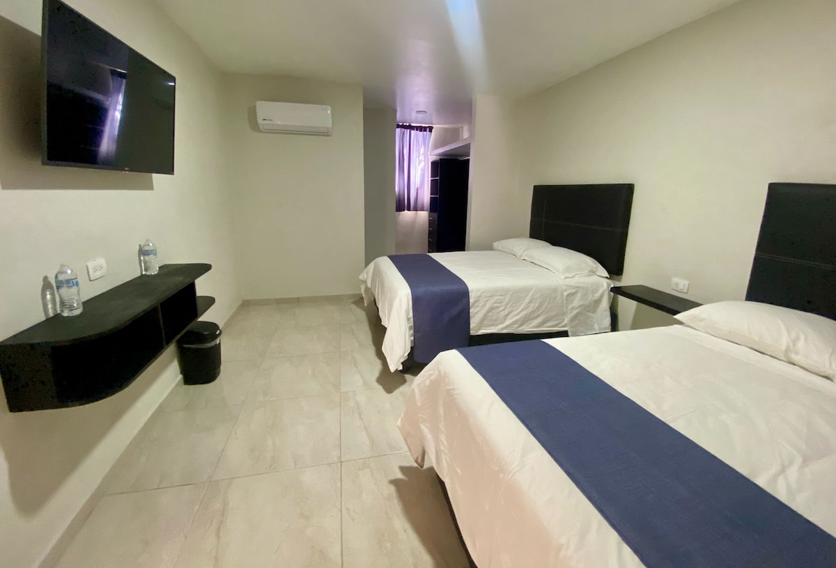Habitación de hotel con entrada independiente cuenta con: -1 Baño completo -Agua caliente -2 toallas, jabon y shampoo -Cama king size sognare y 2 almohadas -Aire acondicionado -TV con roku -WIFI -1 Closet -1 rollo y 2 botellas de agua -Estacionamiento 1 lugar por habitación -llave de habitación y tag de acceso al portón Se entrega limpia y desinfectada. "Importante" Servicios como limpieza (para varios días), alimentos, toallas y cobijas extras no están incluidos.