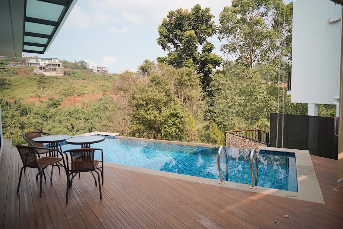 Privat villa, vakker natur hele dagen til natten, luften er ren og frisk. Det koselige balkongområdet er perfekt for å bare prate og grille. Privat evighetsbasseng og takterrasse tilgjengelig med flott utsikt. En villa med en fantastisk atmosfære, med underholdningsfasiliteter (biljard og karaoke), nær de mest populære kafeene i Bandung City. for gjester som bor med småbarn, tilbyr vi et lekeområde for din elskede baby, slik at de blir gjerne med og nyter oppholdet ditt