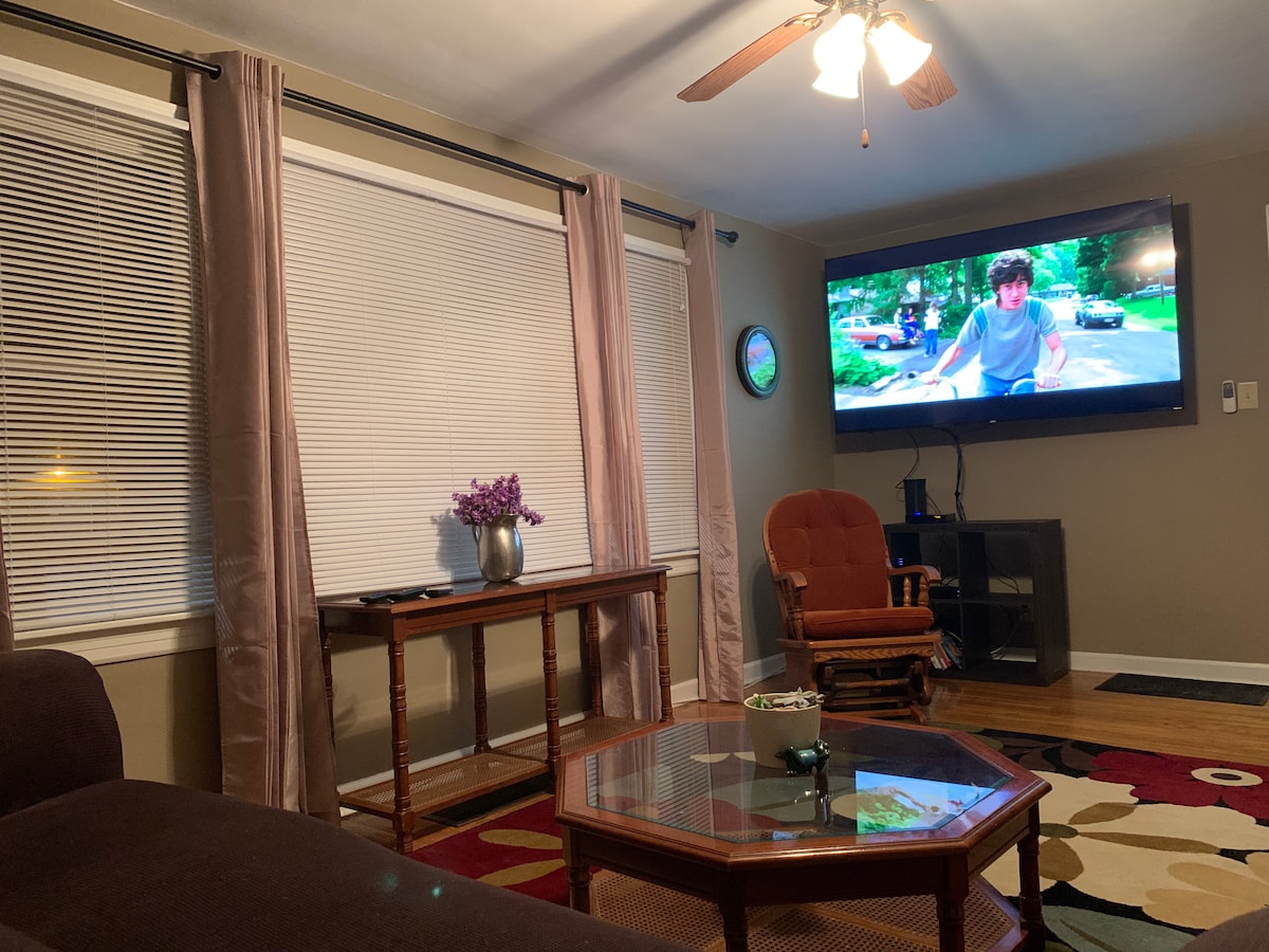 Hjem med to soverom i flere etasjer. Hjemmet har en stue, kjøkken og et halvt bad i første etasje, begge soverommene og et fullt bad ovenpå. Det er en TV nede i stuen og en på et av soverommene. Huset ligger i et trygt nabolag, og det er en stor parkeringsplass på siden av leiligheten, så det er rikelig med parkering utenfor gaten. Nok plass til å kjøre inn og ut med lastebil og tilhenger! For reservasjoner på mer enn to netter har vi en vaskemaskin/tørketrommel tilgjengelig.