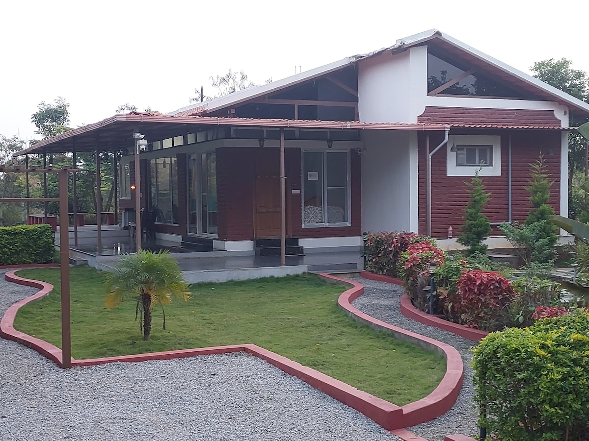 Need a PEACEFUL Break, from the ever hustle bustle of city life? Look no further. Come nestle yourself in the midst of greenery of fruit orchard. Enjoy the fresh breeze in the lawns. Come here to just relax,do nothing... Read a Book, Sip Wine, Light camp fire, Watch variety of birds... If not, dont do anything, just relax.. Sustanibly built high roof keeps the house cool at all times. Located inside gated farm house community "Nature Senses", security for self and pets are assured. WELCOME