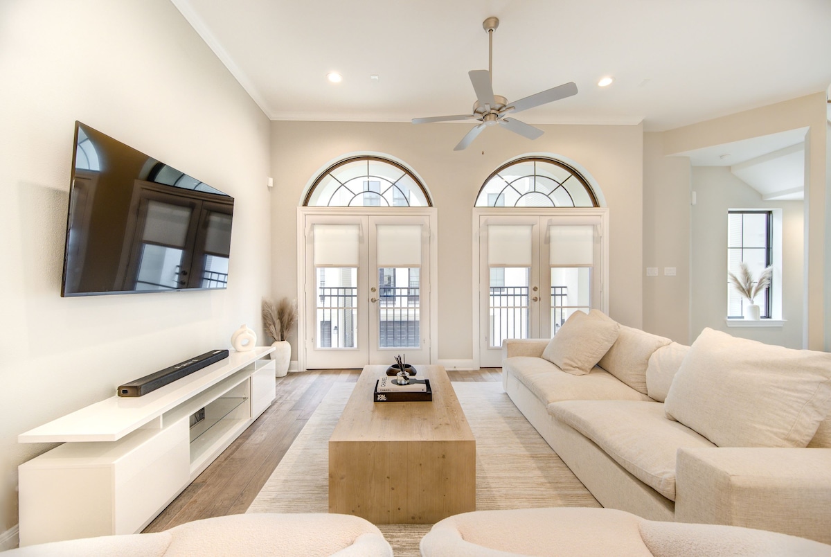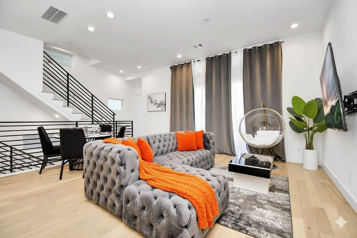 Opplev luksus i dette rekkehuset i Houston med tre soverom, hvert med eget bad/TV. Smarthjemmet har automatiserte låser, lys, støvsugere og termostater. Andre etasje er et åpent rom med kjøkken, spisestue og stue med en 85" Samsung-TV, biljardbord, brettspill og minibar. Det er en liten arbeidsstasjon på soverommet nedenunder og et kontorlokale med fullt arbeidsoppsett. Nyt sitteområdet i bakgården. Ligger under 8 km fra NRG Stadium og Minute Maid Park.