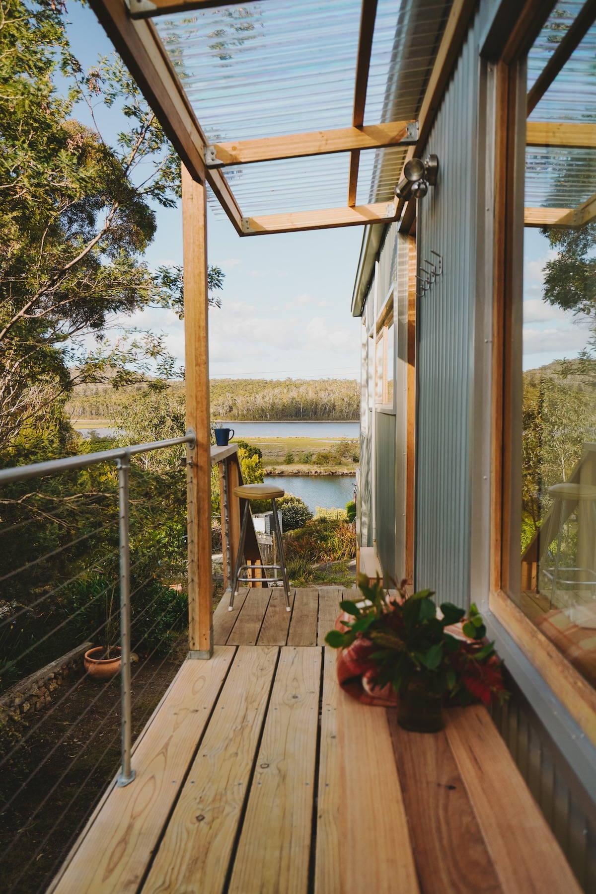 Elven renner; tiden står stille. Slow River ligger i en rolig sving i Scamander-elven, bare noen minutter fra Tasmalias storslåtte østkyststrender, og er et moderne fristed hvor 180° utsikt møter perfekt kaffe og solfylt liv. Dette stilig designede hjemmet er laget for elskere og venner som søker dyrebare øyeblikk og et stykke tasmanisk ro og skjønnhet.