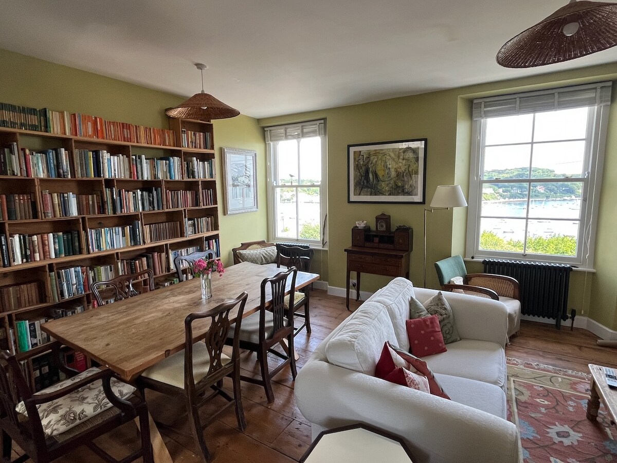 Nydelig luftig georgiansk leilighet i et Grade II-oppført herskapshus med utsikt over havnen i hjertet av vakre Falmouth. Alt ligger innenfor gangavstand, så du trenger ikke bilen din: Events Square og hundrevis av flotte restauranter og butikker ligger alle noen minutter unna! En liten merknad, det er en ølhage i nærheten, det er sjelden, men det kan være støy. Normalt bare et problem hvis du prøver å sove med vinduene åpne.