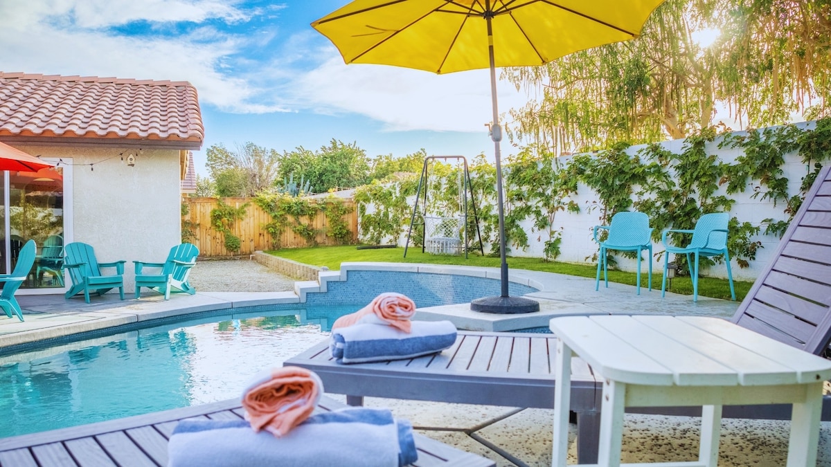 Velkommen til vårt utsøkte 5-stjerners tilfluktssted i Indio! Vårt vakkert designede hjem er perfekt for familier, feiringer og gruppereiser. → Dykk ned i moroa: Plask ned i den doble vannsklien og babybassenget for de minste. → Spill på: Slipp løs din indre gamer med arkadespill og spenning på biljardbordet. → Kulinariske herligheter: Vårt gourmetkjøkken er klart for dine mesterlige retter. → Casita-komfort: Flykt til oasen din. Lei to hjem ved siden av hverandre for opptil 32 gjester. Kontakt oss for mer.