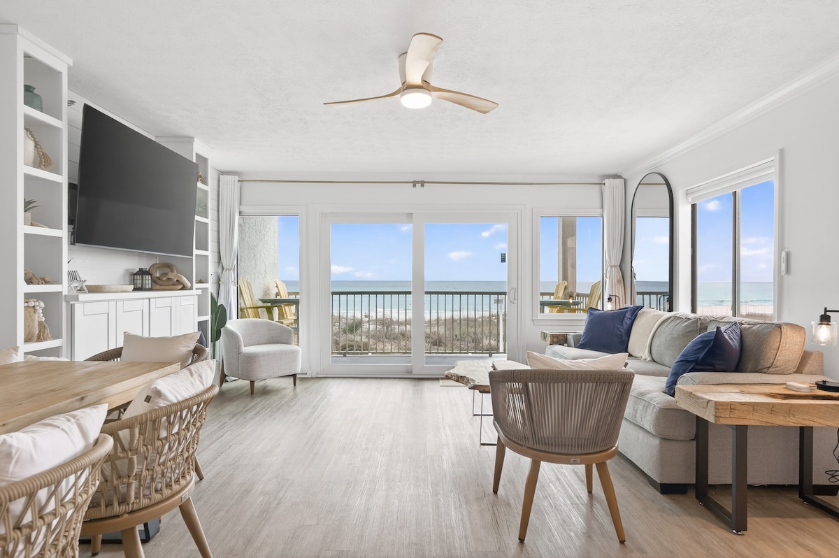 Leilighet ved stranden i Destin når den er best … en skjult perle, en enhet på hjørnet rett ved havet på en privat, rolig strand. Nyrenovert, designerinnredet, unik OG med vidstrakt havutsikt! Beliggenhet i hjertet av Destin i en bygning med lav befolkningstetthet med bare tre etasjer og 29 enheter, som ligger på myk, hvit sand med parkeringsplass i garasjen på stedet! Fantastisk utsikt og rolige havlyder! Gangavstand til Destins mest populære restauranter og underholdning, deilig sjømat rett ved siden av på The Back Porch!