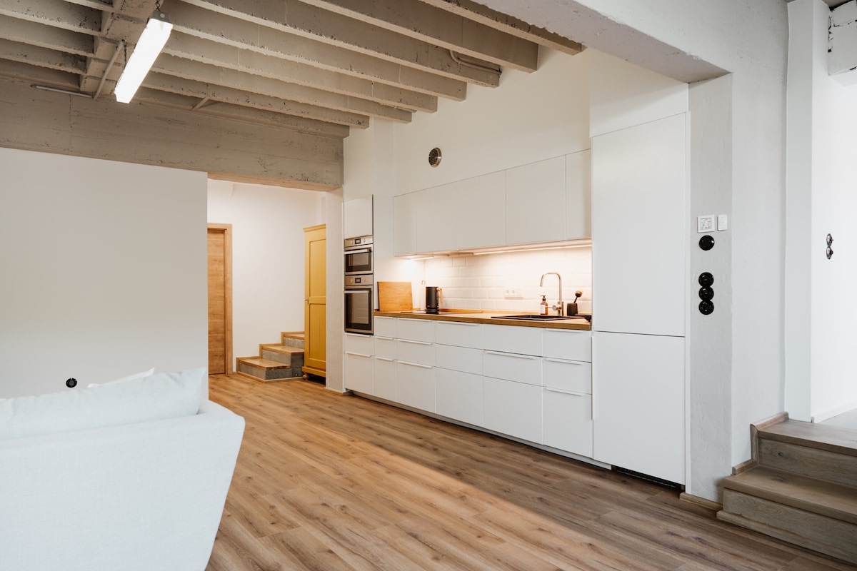 Det 500 år gamle huset ble totalrenovert i 2021. Nyt en avslappende kveld på sofaen under et nøye restaurert stukktak fra barokktiden, ta en titt på de historiske detaljene som finnes i hele leiligheten, og føl deg vel i den kjærlig innredede leiligheten. To soverom med dobbeltseng og eget bad, velutstyrt kjøkken og bare to minutters gange fra elvebredden med badebukt.