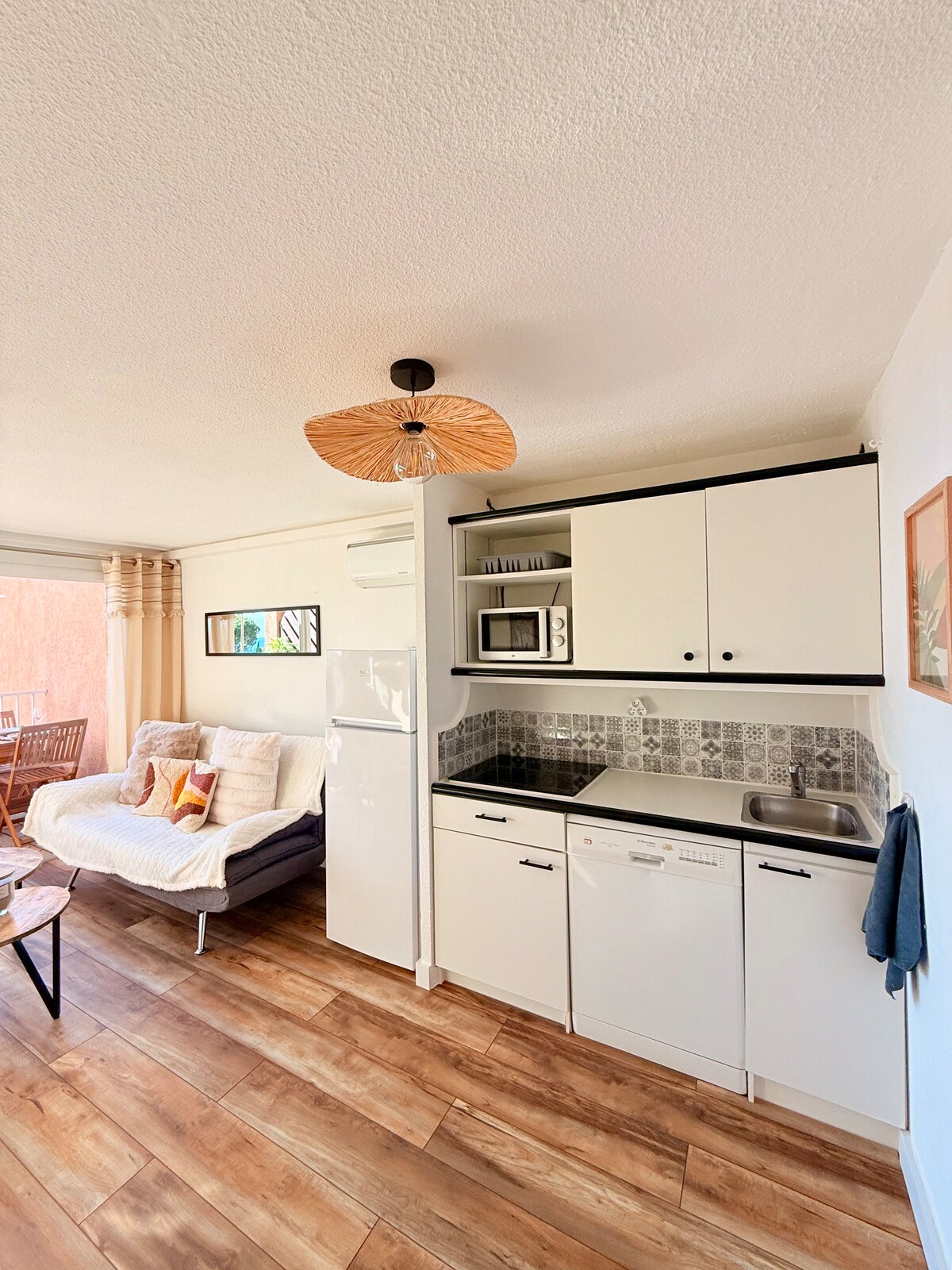 Studio 300 meter fra stranden, i hjertet av badebyen og 100 meter fra turstier. 26 kvm og 8 kvm terrasse. I første etasje i en liten tre-etasjes bygning. Utstyrt kjøkken kjøleskap /keramisk platetopp 2 branner /mikrobølgeovn/miniovn/nespresso /vaskemaskin 140 senger Sengetøy og baderomssengetøy Ingen rengjøringsgebyr, da leiligheten må rengjøres. Rengjøringsprodukter på stedet. Privat parkering (smal plass). Alle butikker til fots.