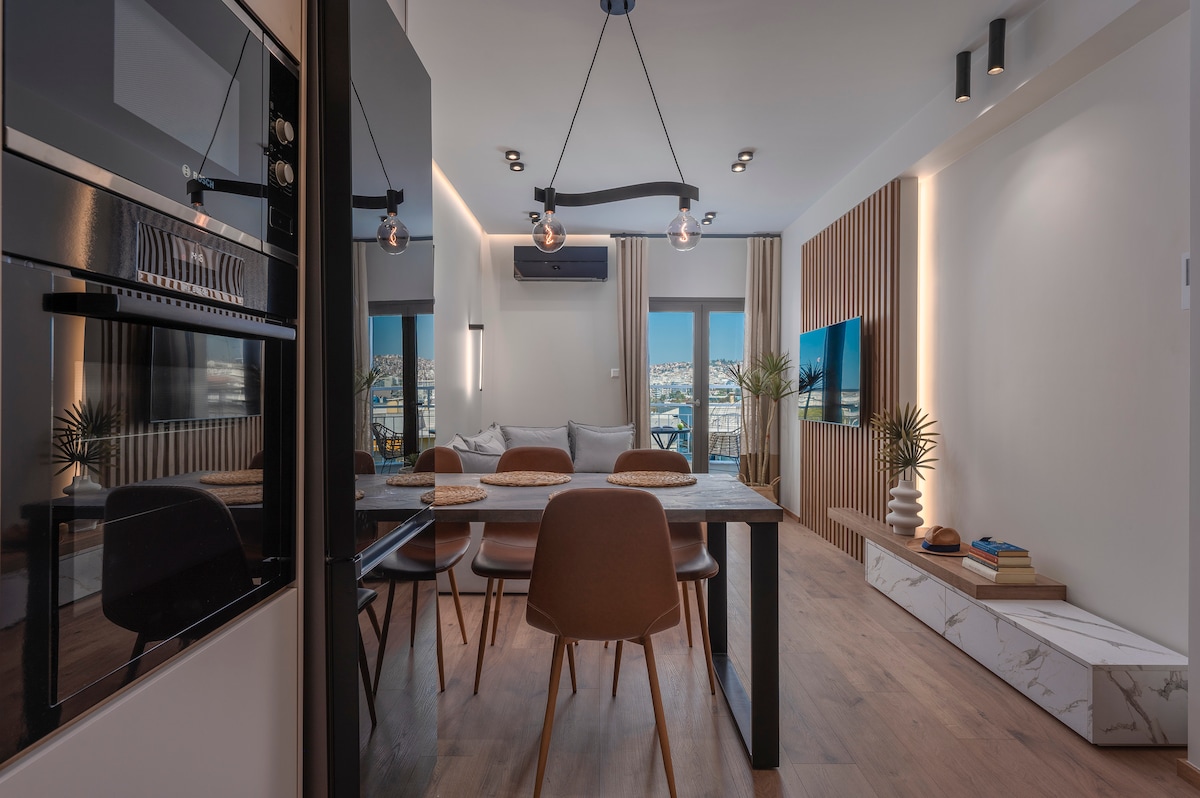 Unik 1 soverom fullt utstyrt leilighet i syvende etasje i en 2020 renovert bygning med en fantastisk terrasse balkong. Trådløst nettverk med høy hastighet, førsteklasses fasiliteter, en luksuriøs queensize-seng og din egen Netflix-konto er bare noen få ting vi tilbyr deg. Lysende, romslig, med alt du trenger for å nyte ditt opphold i hjertet av Thessalonikis sosiale liv, bare 5 minutter fra Aristoteles-torget og 2 minutter fra strandpromenaden. Velkommen og kos deg under oppholdet ditt!