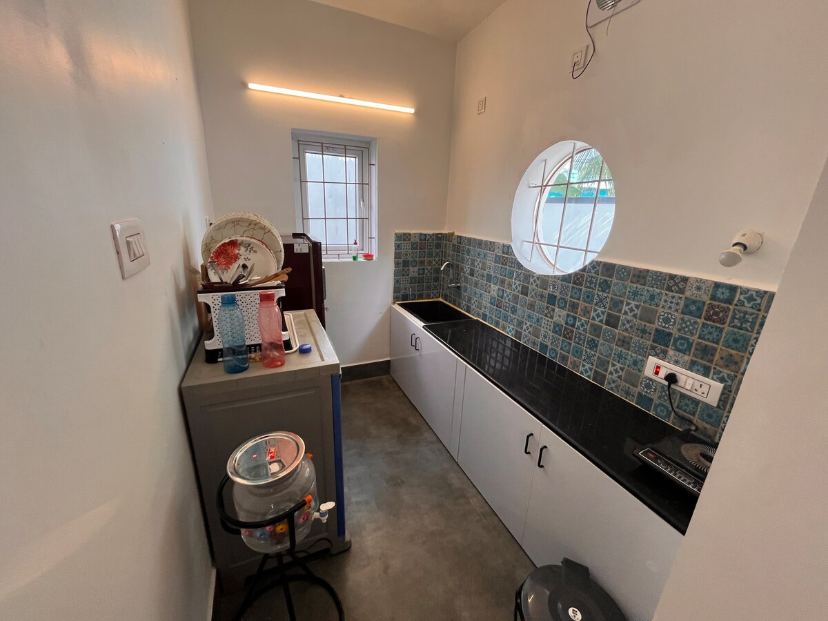 Denne hjemmeoppholdet er for deg som har tid og ønsker å nyte et langsomt liv, oppleve romslig boende og slappe av i hagen på taket med boblebad innenfor gangavstand fra stranden. Dette 2BHK-hjemmet ligger i første etasje og er utstyrt med moderne fasiliteter. Alle soverom har tilgang til eget bad. Soverom 1 har badekar, mens soverom 2 har et romslig dusjområde. Soverom 2 har mer oppbevaringsplass, en dedikert arbeidsplass og tilgang til en balkong, også tilgjengelig via stuen.