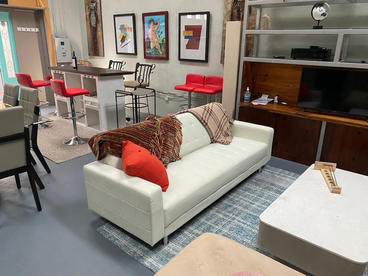 Hvis du ser etter en avsidesliggende fjellferie, er dette ikke stedet, men hvis du ønsker å være i hjertet av sentrumsfestlighetene, er loftsleiligheten vår det perfekte stedet for deg! Loftsleiligheten vår har lokal kunst, en liten balkong, høyt tak og synlig murstein. Vi er midt i sentrum av all action. Du er bokstavelig talt noen skritt unna utrolige håndverksøl, prisbelønt mat og regional musikk. Sentrum er livlig, spesielt om natten, hvor du kan henge og se et lokalt funkband eller dra ned til trommesirkelen, sove lenge og deretter gå ned for en massasje. Luksuriøst loft i sentrum i andre etasje i en historisk mursteinsbygning. Sittende balkong med utsikt over College St. Fullt utstyrt kjøkken. Kaffemaskin Kaffe og te er inkludert. HDTV med Sling TV, Netflix og lokale kanaler. Trådløs høyttaler. Uttrekkbar sofa med Sealy Posturepedic-madrass. Queensize-seng med minneskummadrass og puter. Vaskemaskin og tørketrommel. Vi bor i Asheville i nærheten, men ikke i bygningen, men svarer gjerne på eventuelle spørsmål du måtte ha. Hjemmets praktiske beliggenhet i sentrum gjør at den pulserende Asheville-kulturen ligger rett utenfor døren. Spis på prisbelønte restauranter og bakerier, prøv noen nye drinker på de lokale bryggeriene og nyt det energiske nattelivet i området. Du er i nærheten av flere parkeringsplasser. Du trenger ikke å kjøre med mindre du skal til River Arts District, Biltmore House eller på fotturer i fjellet. Loftsleiligheten ligger mellom Lexington Ave og Haywood St, og det er ett minutts gange til Pack Square og Biltmore Ave og tre minutters gange til Grove Arcade og Wall St. Taxier og Uber kjører hele tiden. Vi tillater hunder med forhåndsgodkjenning. Bygningen har heis. Inngangen til bygget har sikker tilgang med tastaturlås. Soverommet ligger på innsiden av leiligheten med skyvedører for å skille rommet fra stuen og vinduene. Downtown Asheville kan være bråkete, og musikk kan høres de fleste netter. Vi har en hvitstøymaskin og ørepropper for å minimere forstyrrelser. Det kan imidlertid være høyt for gjester som sover på sovesofaen i stuen. Vi kan ikke utstede refusjoner for støy som kommer fra nabolaget rundt leiligheten.
