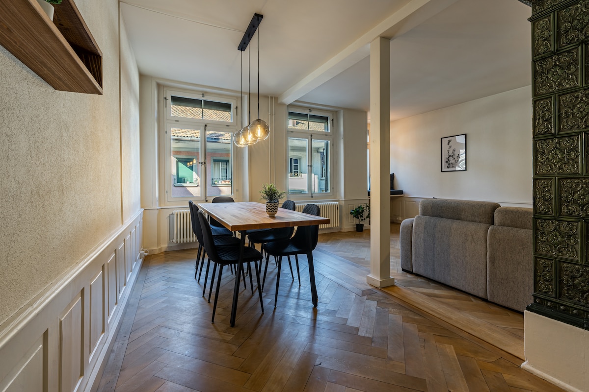 ✨ Historisk juvel i hjertet av Thuns gamleby! ✓ førsteklasses beliggenhet: 🏰 bare 50 meter til slottet og midt i gamlebyen ✓ Masse plass: 🏠 romslig leilighet på 96 kvm ✓ Høy hastighet: ⚡ raskt trådløst nettverk – ideelt for arbeid og hjemmekontor ✓ Thun stasjon: 🚂 7 minutters gange unna. ✓ Komfort: 📺 65 tommers smart-TV (Netflix), ☕ Nespresso og 🧺 vaskemaskin/tørketrommel. ✓ Koblingspunkt: 🏔️ perfekt base for Interlaken, Jungfrau-regionen og Bern ☆☆☆☆☆ «Beste beliggenhet for Jungfrau-regionen! Slott rett ved siden av!»