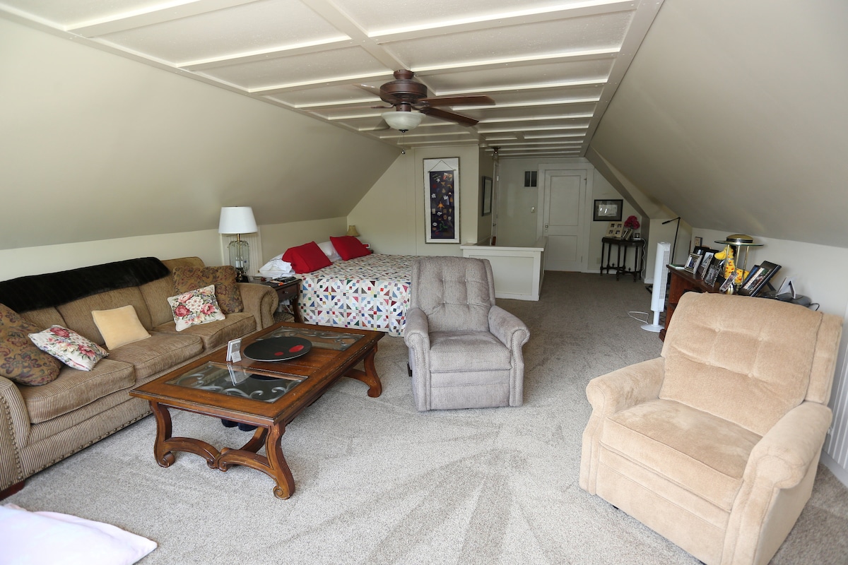 We have a large loft area, with a private full bath. It is the whole upstairs in my house. There is no door between the upstairs and downstairs. There is a comfy couch, loveseat with two recliners & a large TV. There are two California Twin Beds pushed together making a King size Bed. We have a stair chair to get up the steep stairs. We have two dogs and a cat & a great backyard with a tiny pond.