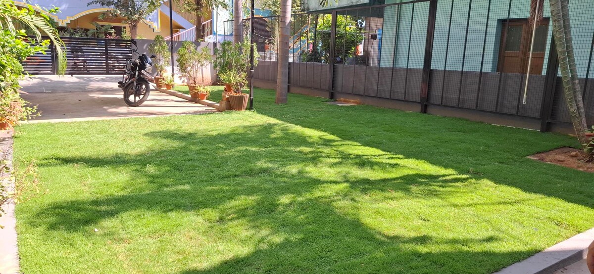 Slapp av med familien din på denne fredelige og private 1BHK-hjemme i første etasje i et frittstående hus i Tirupati. Stedet tilbyr fullstendig privatliv med egen inngang, soverom, stue, kjøkken og tilknyttet bad. En liten hage/åpent område er tilgjengelig for avslapning. Verten bor i første etasje. Beliggende i et rolig boligområde med enkel tilgang til templer og transportpunkter.