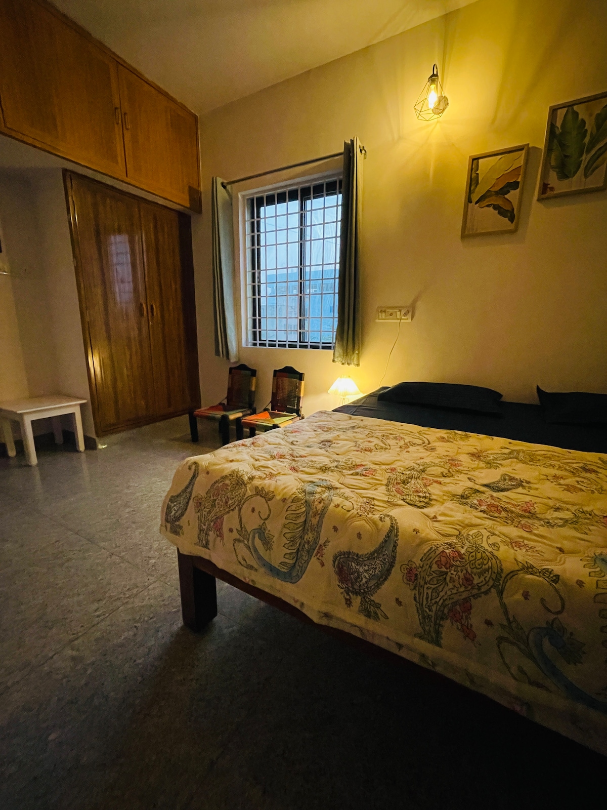 Reis til et romslig og fredelig tilfluktssted med fantastisk, direkte utsikt over den hellige Tiruvannamalai-bakken. Dette rolige overnattingsstedet ligger bare minutter fra Yogi Ramsuratkumar og Sri Ramana ashramam, og tilbyr den perfekte blandingen av komfort og åndelighet. Annamalaiyar-tempelet ligger bare to minutters kjøretur unna, noe som gjør det ideelt for både pilegrimer og reisende. Dette hjemmet ligger i et rolig nabolag uten mye folk, og det inviterer deg til å slappe av, lade opp og oppleve Tiruvannamalais unike energi i ro.
