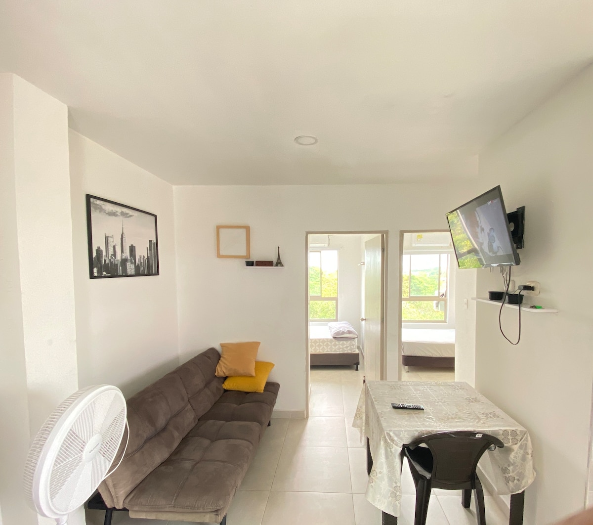 Tre soverom – alle med garderobeskap og bad. Sosialt bad – klimaanlegg – 4 smart-TV-er. Dette er et sted å hvile. Luksus. Trådløst nettverk, fire smart-TV-er med Direct TV, YouTube Premium, Netflix, Amazon Prime og Disney + brettspill. Assistent hos G. Home og Alexa. (Spotify Premium musikk – YouTube Premium – Veldig pent innredet. Vakker utsikt. Fullt begavet. Tilgang til basseng, jacuzzi, strand, lobbybar. To parkeringsplasser. Porter. Pålitelig butikk. Salg av produkter med automatisk betaling