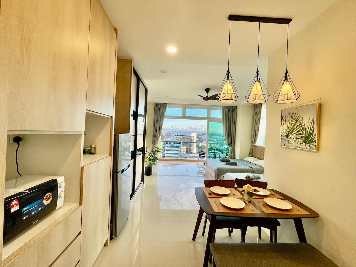 Opplev stilig urban livsstil i dette elegant designede studioet, hvor moderne komfort møter rolig atmosfære og bysjarm. Den ligger i et fredelig, men levende nabolag. tilbyr et tilfluktssted mens du er i nærheten av flyplassen, kjøpesentre og sentrum. Ideelt sted å slappe av og lade, nyte panoramautsikten over Kuching City fra din private balkong. Dette studioet med kjøkken har plass til opptil tre personer, perfekt for par, forretningsreisende og familie. ★ Gratis parkering (avhengig av tilgjengelighet)ogbasseng.