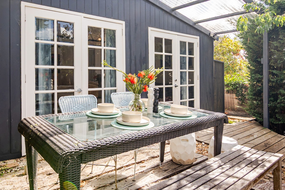 A peaceful rural outlook, sounds of frogs and birds, while lying in a luxurious bath in a stylish, spacious retreat, super comfy queen bed. 2.5km to Whites beach. Note: The studio is attached to our house, you may hear general life kitchen/tv noise, but you have a private entrance and secluded easterly deck. BBQ, & kitchenette with microwave, air fryer, rice cooker, kettle, toaster. Dog friendly. PLEASE - dog bath before arrival, bring a towel for muddy/sandy paws.