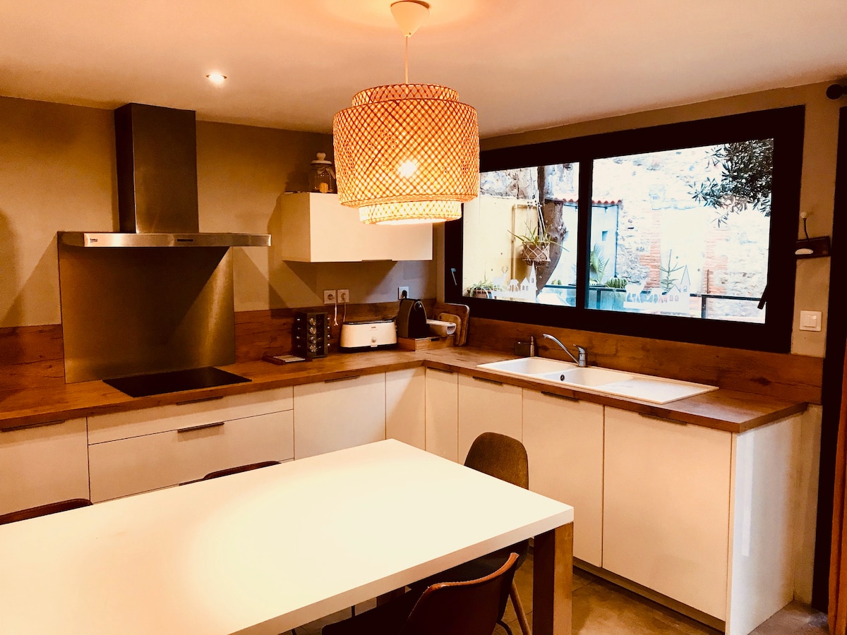 Nelly bygget rekkehus på 50 m2 (538 kvm) med romslig utendørs, svømmebasseng (delt med oss), utsikt over "les Albères". Sorède ligger fordelaktig mellom havet og fjellet. Det ligger ti minutter unna Argeles sur mer, 15 minutter fra Collioure, 20 minutter fra Spania og Perpignan. Det er 1 time og 30 minutter unna Barcelonais og skianlegg. Huset vil gi et rolig, rolig og komfortabelt opphold med alle fasiliteter. Det ligger i nærheten av landsbyens butikker og underholdning, turstier og terrengsykkel.