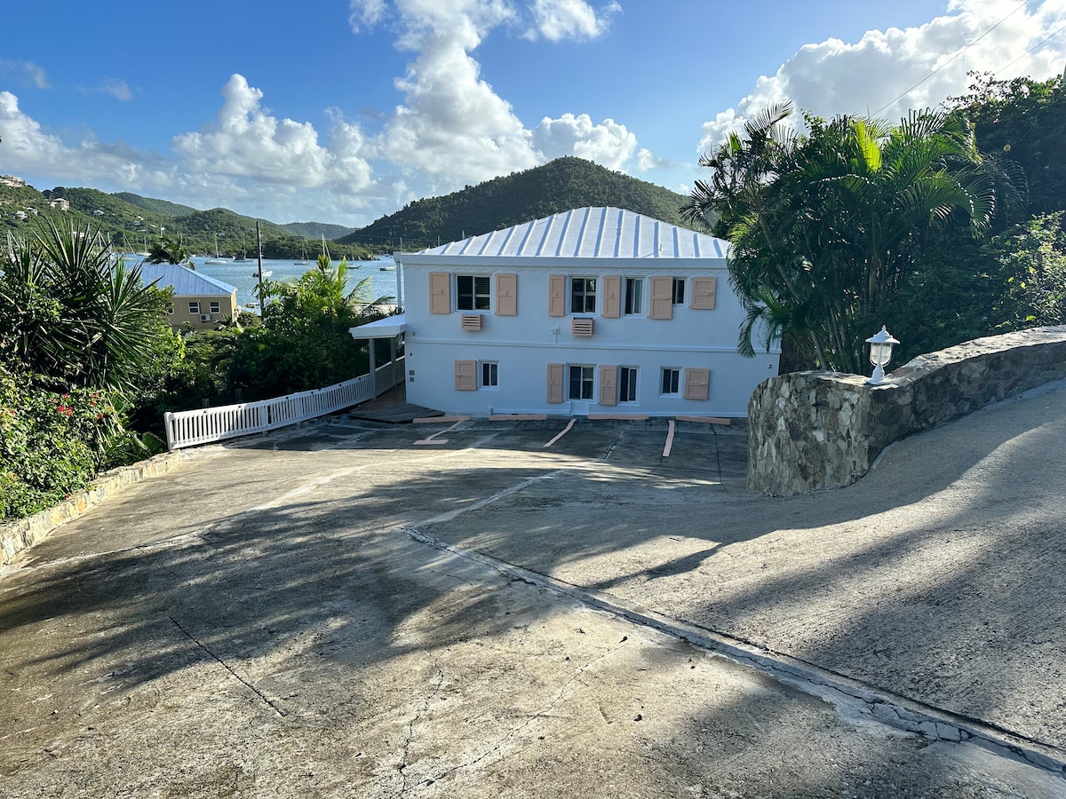 FRISK OG OPPDATERT studioenhet i hjertet av Cruz Bay på Grande Bay Resort. Studio-suite med kingsize-seng, en fullt utfoldbar sofa, kjøkkenkrok og sitteområde i stuen, vaskemaskin og tørketrommel. Fantastisk utsikt fra innsiden og balkongen ligger høyt oppe på bakken med utsikt over Cruz Bay og omgivelsene. Flott for bryllupsreise, jubileum eller en hvilken som helst ferie! Veldig ren enhet og godt utstyrt møblering. Våkn opp til det karibiske blå vannet og solen! Vær oppmerksom på at PARKERING IKKE er inkludert – betalt parkering utenfor stedet eller taxi.
