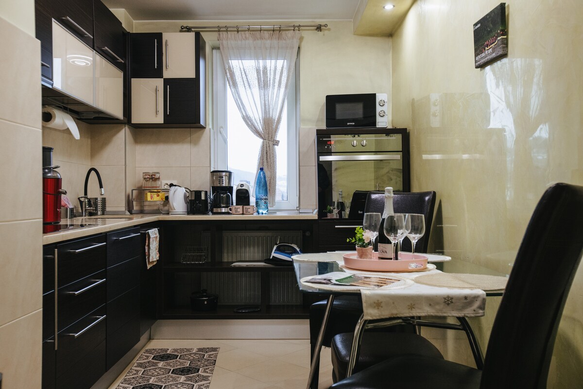 Tilbring uforglemmelige øyeblikk i den bohemiske leiligheten, nyrenovert, fullt utstyrt og utstyrt, som ligger i hjertet av Brasov. Vi vil møte deg med kjøkken utstyrt med servise ,bestikk, arbeidssett og alle nødvendige apparater. På badet tilbyr vi dusjgel, sjampo, flytende såpe, håndklær , dusjboks, tøfler, vaskemaskin med innebygd tørketrommel, vaskemiddel, strykejern, tørketrommel. Du kan beundre Tampa Mountain,fra den lange balkongen.