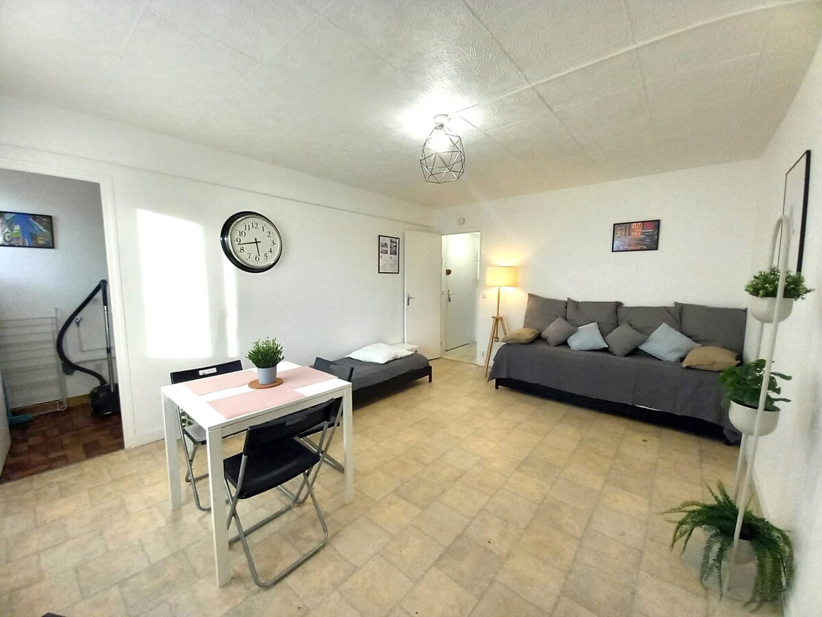 Vi vil gjerne ønske deg velkommen til vår nyoppussede studioleilighet i et rolig boligområde nær alle fasiliteter. Sengetøy og håndklær er inkludert, samt kjøkkenutstyr, toalettartikler og rengjøringsprodukter. Sofa med madrass 160*190, svært komfortabel I nærheten av jernbanestasjonen som betjener Paris-Montparnasse på 35 minutter, alle fasiliteter er tilgjengelige til fots (bakeri, cocci marked, tobakk presse) og kjøpesentre 5 minutter med bil.