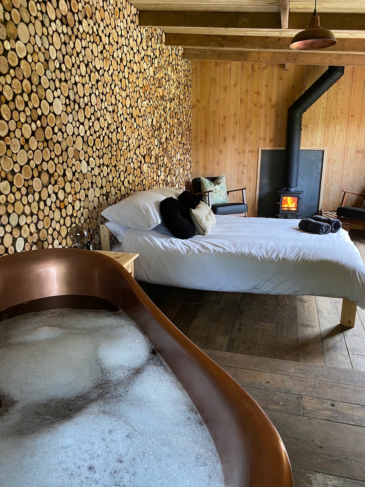Håndlaget tømmerhytte, som ligger alene i Wye Valley AONB, Wales. Tradisjonell karakter, sammen med en rekke moderne bekvemmeligheter. Åpne stuer, to soverom og et bad. Komfortabelt plass til 4–6 personer. Fullt utstyrt kjøkken med oppvaskmaskin og maskin for varme drikker. Vedfyring. Smart-TV. Trådløst nettverk uten ekstra kostnad. Sengetøy, luksuriøse håndklær og badekåper. Velkomstpakke inkludert Prosecco. Stort vedfyrt boblebad, senket ned i dekket på balkongen. Terrasseområde med møbler. Bålpanne med grill. Mange dyr.