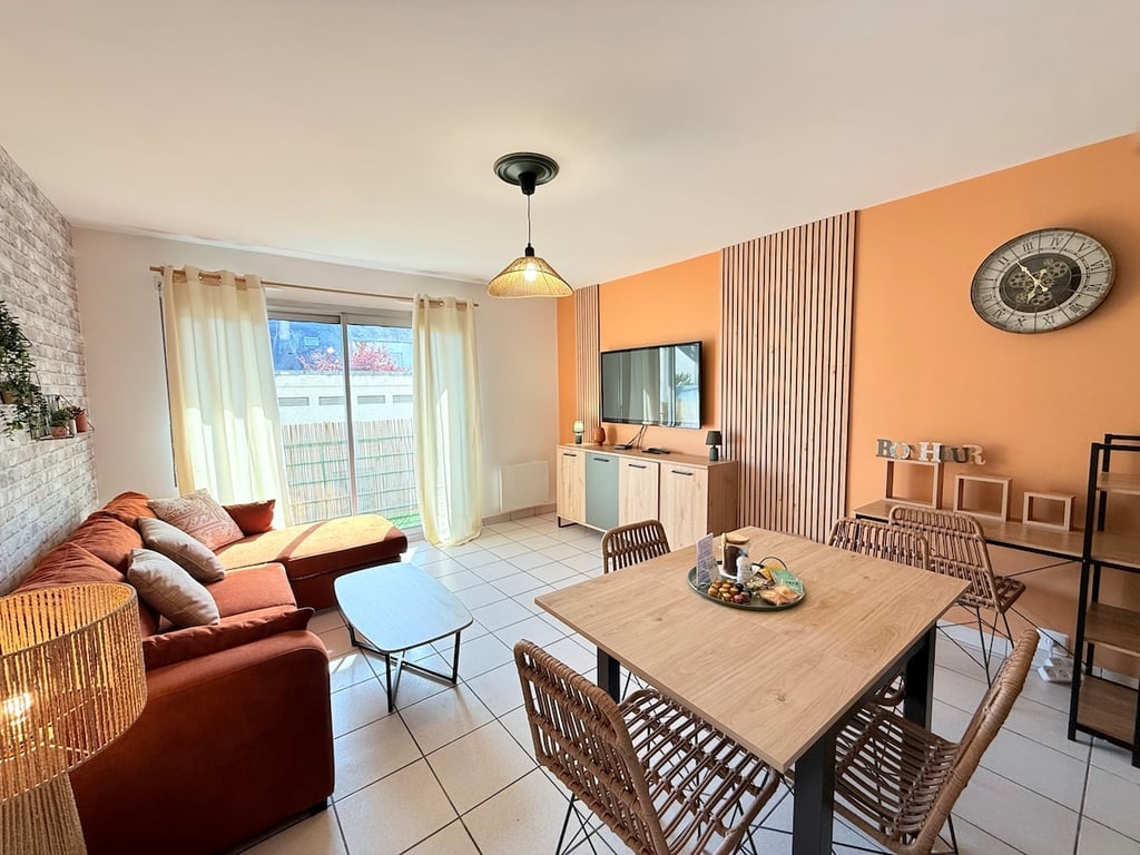Leiligheten "L'Atlantique 1" ligger 300 m fra stranden og Place du Commando (barer og restauranter), 300 m fra ubåtbasen (Escal'atlantic) og havnen, 300 m fra kjøpesenteret Ruban Bleu, butikker, kino og teater. Leiligheten T2 på 38 m² ligger i 1. etasje, med utsikt over hagen. Den er veldig lys og har en stor balkong. Den er fullstendig renovert med soverom (seng 160), stue (sovesofa 140), separat toalett, bad, kjøkken.