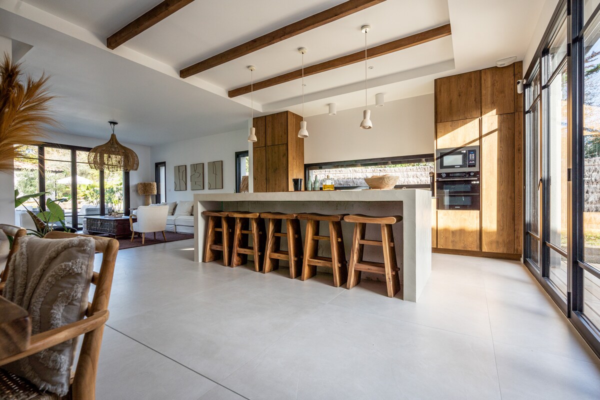 Vakker, nyrenovert villa på høydene i Saint-Marguerite, 15 minutter fra stranden. Den er romslig og moderne, og tilbyr tre soverom, inkludert ett med en sovesal, et utstyrt kjøkken som er åpent til en treterrasse, en koselig stue med vedovn og et sikkert oppvarmet svømmebasseng. Lukket hage, privat parkering. Utleie reservert for respektfulle familier og grupper. Kjæledyr og fester.
