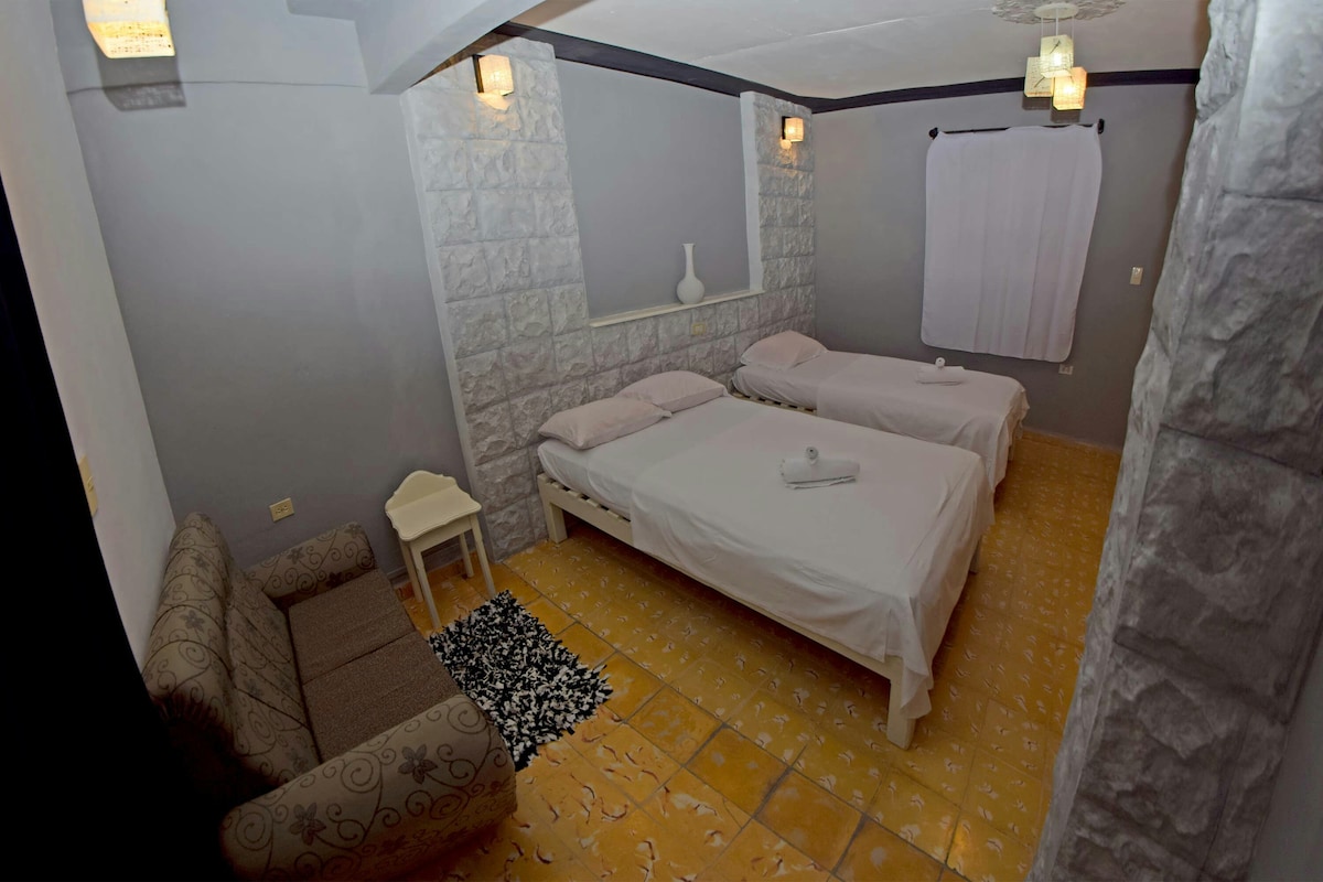 Kolonialhuset ble gjenoppbygget i 1925 og ligger 5 minutter fra hjertet av byens historiske sentrum og mindre enn 200 meter fra det moderne sentrum. Vi leide 2 rom med utsikt over den indre gårdsplassen (rom 1 og rom 2, et annet utleiested), godt ventilert og med eget bad. Vi tilbyr frokosttjenester, snacks, vaskeri, wi-fi og taxi.Vi gjør vårt beste for å få deg til å nyte ferien din og samtidig bli kjent med livet til den cubanske familien.