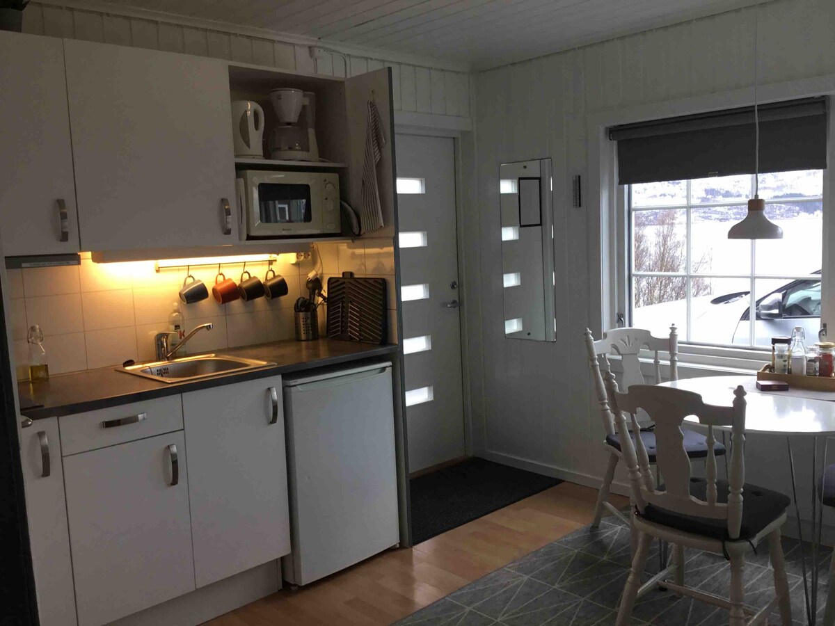 Hytte som ligger helt ved sjøkanten, stille område uten gjennomgangstrafikk. Dette er plassen hvor du blir alene i ro og fred. Enkel tilgjengelighet med 30 meter fra trafikkert vei. Greit med parkering. 32 km fra flyplassen. Flere matbutikker på vegen fra flyplassen. Veldig gode muligheter for nordlys, skiturer, fisketurer og flere turoperatører i nærheten. (hundekjøring, havfiske, fjellturer)