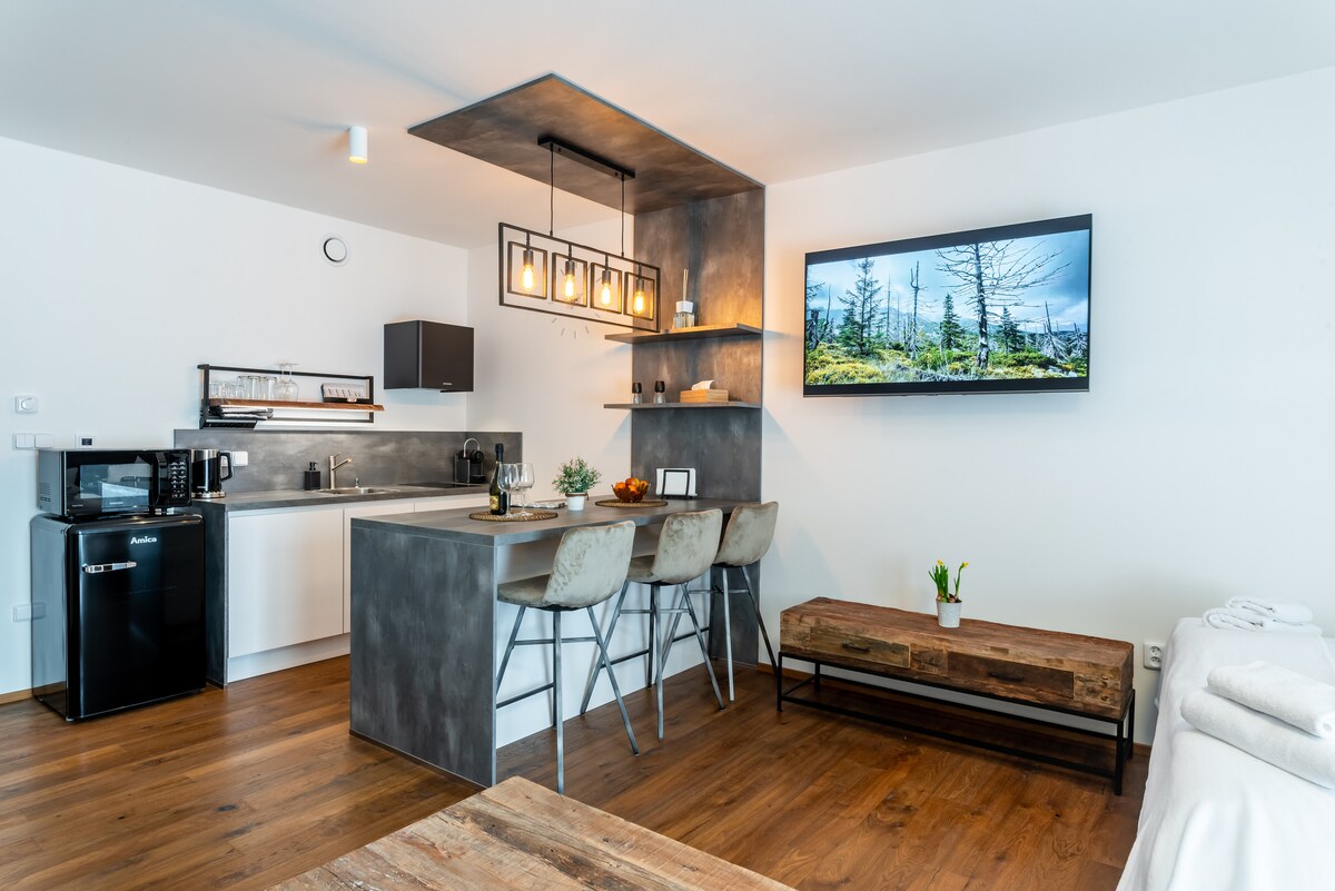 Krakonoš-leiligheten er en toetasjes koselig og luksuriøst utstyrt overnatting i en 35 m² fjellhytte. Den tilbyr et fullt utstyrt kjøkken med Nespresso-kaffemaskin, ovn og TV, bad med stor dusj. Soverommet på loftet har en dobbeltseng + én ekstra seng. Takket være beliggenheten kombinerer den fred og autentisk fjellatmosfære med tilgang til Pec sentrum, Relax Park og taubanen til Sněžka. Det perfekte stedet for avslappende og aktive ferier i Giant Mountains.