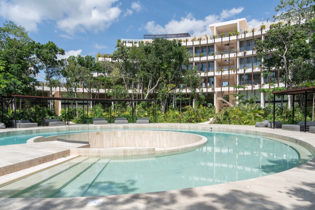 Fantastisk loftsleilighet med direkte tilgang til bassenger, i nærheten av Tulum sentrum og bare noen minutter fra den spektakulære stranden og Tulum strandklubber. Nyt flere fantastiske svømmebassenger, et basseng på taket, solsenger, et fint treningssenter, ansatte døgnet rundt, kraftig klimaanlegg, heis, raskt trådløst nettverk (400 Mbps), mørkleggingsgardiner, 55 tommers smart-TV, et fullt utstyrt kjøkken og privat parkering. Opplev utendørs servering eller bare drikke med vakker panoramautsikt på takrestauranten. Gratis skyttelbuss til en strandklubb er inkludert.