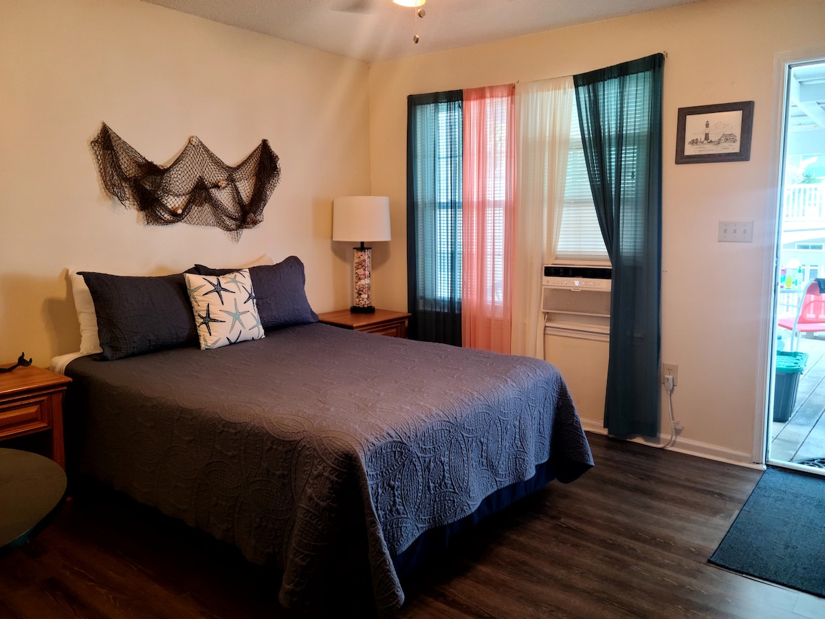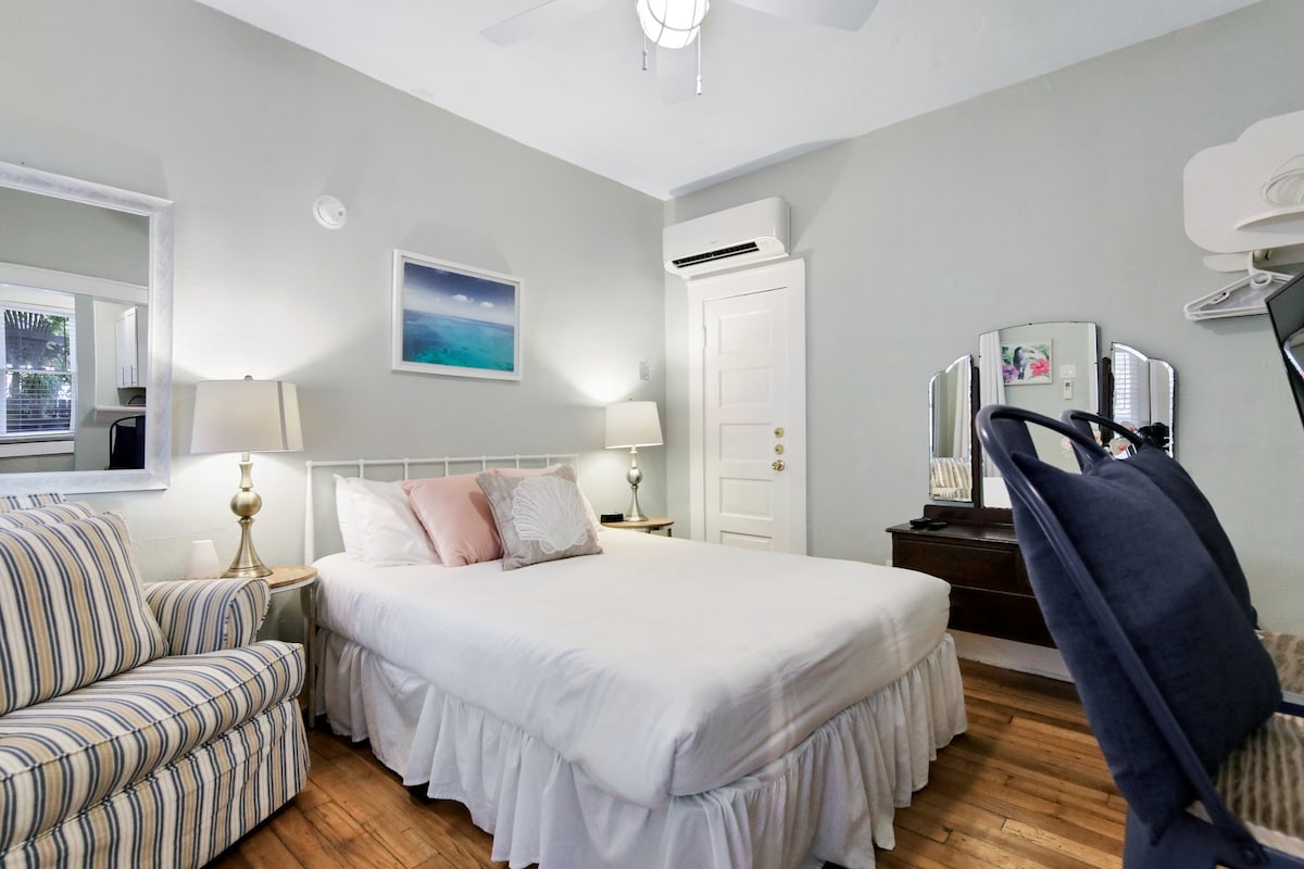 BELIGGENHET, BELIGGENHET, BELIGGENHET Denne effektive studioleiligheten passer perfekt for to personer. Den ligger i andre etasje. For din komfort har leiligheten en ny queen size-seng, egen inngang, fylt kjøkken og eget bad. Det er en stor, felles, overbygd terrasse, flott for å slappe av og snakke med andre gjester. Alle enheter har trådløst nettverk og 50 tommers ROKU-TV-er. Ta med påloggingsinformasjonen din! VI ER I ET KOMMERSIELT OMRÅDE MED BARER, restauranter, osv. DET BLIR HØYLYTT I HELGENE og i høysesongen.