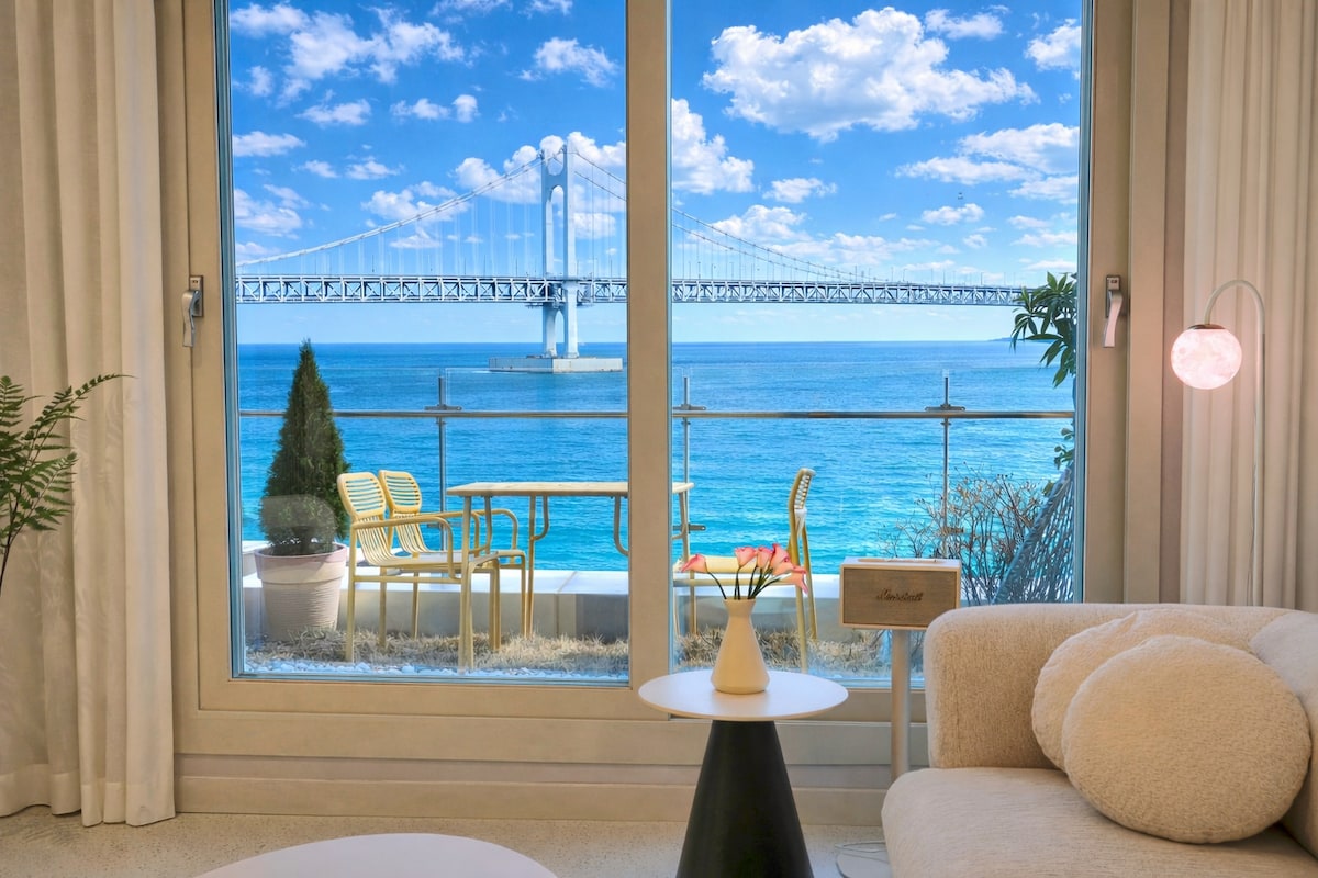 [Gwangan Secret Ocean Room] "Havet foran deg, og du blir værende i følsomheten." Dette er et emosjonelt overnattingssted med havutsikt over Gwangan-broen og havet utenfor det åpne vinduet. Nyt en avslappende stund med musikk i et koselig rom fylt med 📍naturlig lys. Dette er et sted som gjør turen til Busan komplett. Perfekt for par, familier og venner! Gwangan Bridge med full havutsikt 📍Rett foran Gwangalli-stranden Nyt den beundringsverdige utsikten over Gwangan-broen på soverommet og i stuen samtidig. «Gwangan Bridge View foran deg, og en koselig hvile! Opplev en spesiell dag i dette private hjemmet med havutsikt. ✔️Havutsikt fra vinduet ✔️Emosjonelt interiør- og Marshall-høyttaler ✔ Den mest populære overnattingen i Gwangalli, en ny leilighet. ✔ Panoramautsikt over havet + utsikt over Haeundae + utsikt over Gwangan-broen ✔ Emosjonelt interiør og førsteklasses fasiliteter ✔ Gangavstand til Millak Dermarket Hwaryeosen Center Beste utsikt med forskjellig sjarm 📍dag og natt. Del livet ditt med dine kjære.