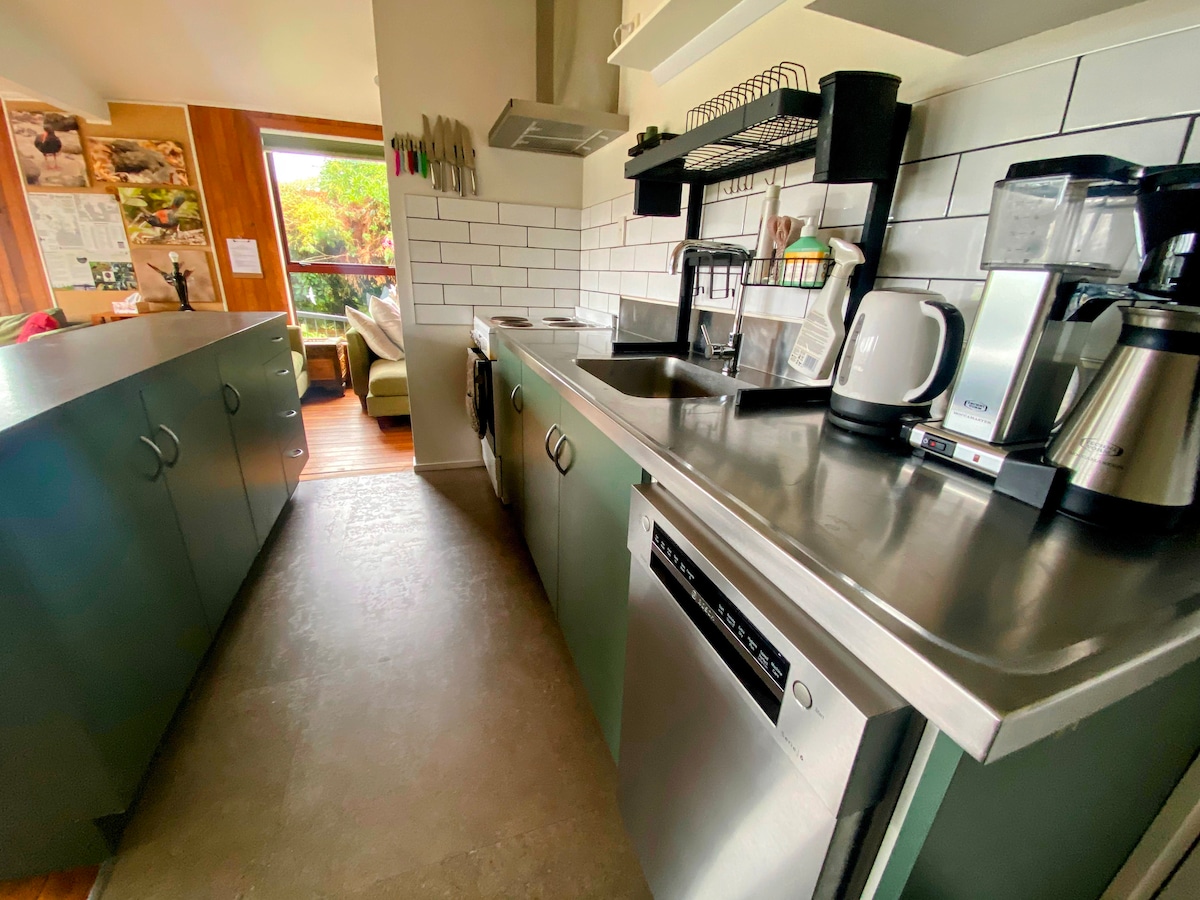Whare manu er en privat, selvstendig boutique-hytte som er soldrevet. Ligger i den opprinnelige busken med utsikt mot havet og stranden, som ligger kun et minutt unna. Se på tuiene og klokkefuglene som spiser i fuglematen rett på terrassen. Designet for par som vil slappe av, koble av og kose seg. Ingen barn, takk. Hvis du ønsker at oppholdet ditt skal inkludere 24. desember, kan du kontakte oss. Vi kan åpne for deg. Det er ingen utsjekkinger 25. desember, og det er minst to netters opphold. Dette er et unikt sted.