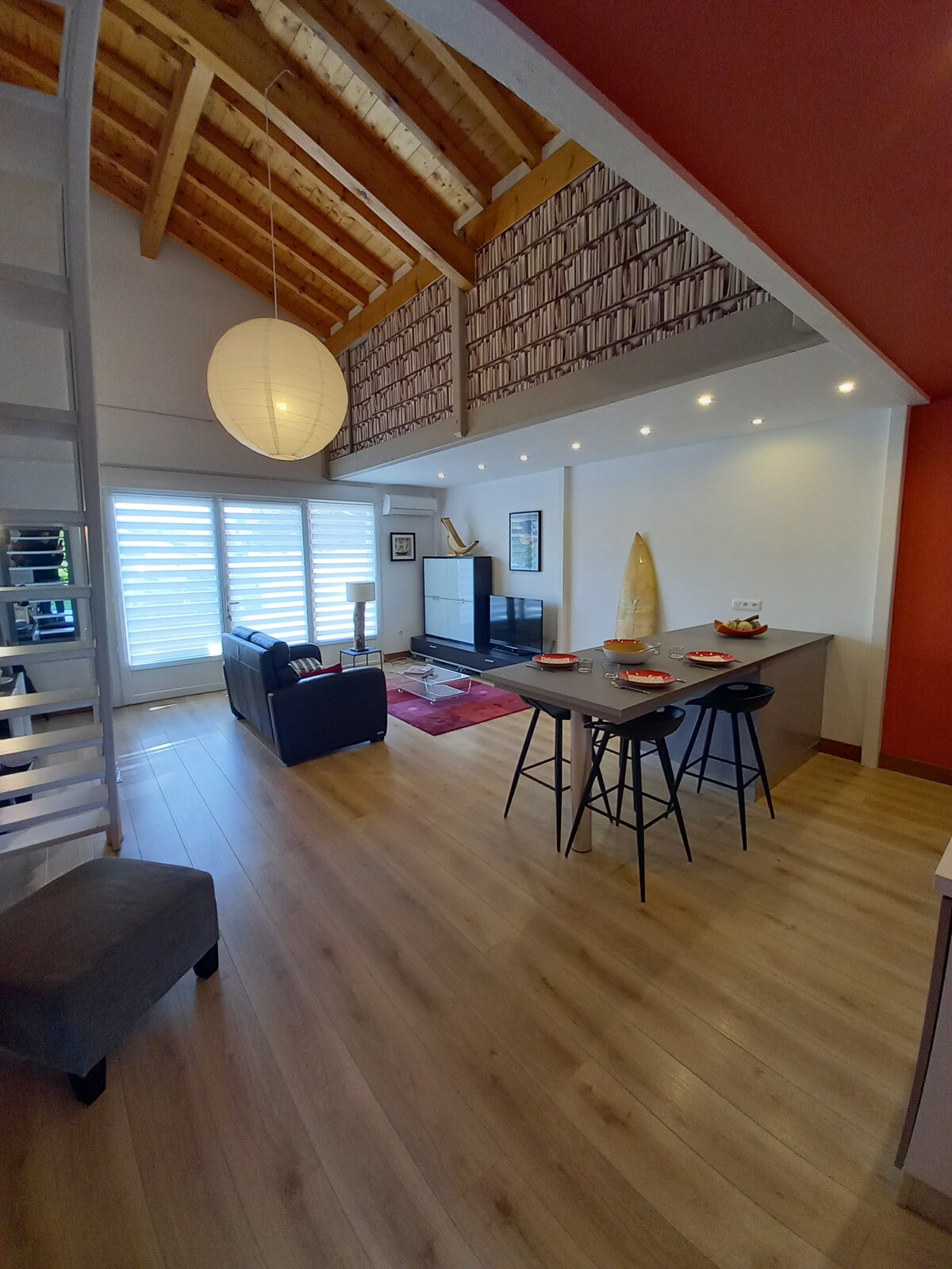 Stor leilighet på 70 m2 i første etasje i enebolig bebodd av eierne (egen inngang). Stor terrasse med markise. 1 soverom med 1 seng på 140 Åpent kjøkken: induksjonstopp, ovn, mikrobølgeovn, kjøleskap, oppvaskemaskin, små husholdningsapparater Spisestue / stue: bord med 4 stoler, sofa, lenestol, salongbord, TV, HI FI Bad: dusj, vask og bidet Separat toalett