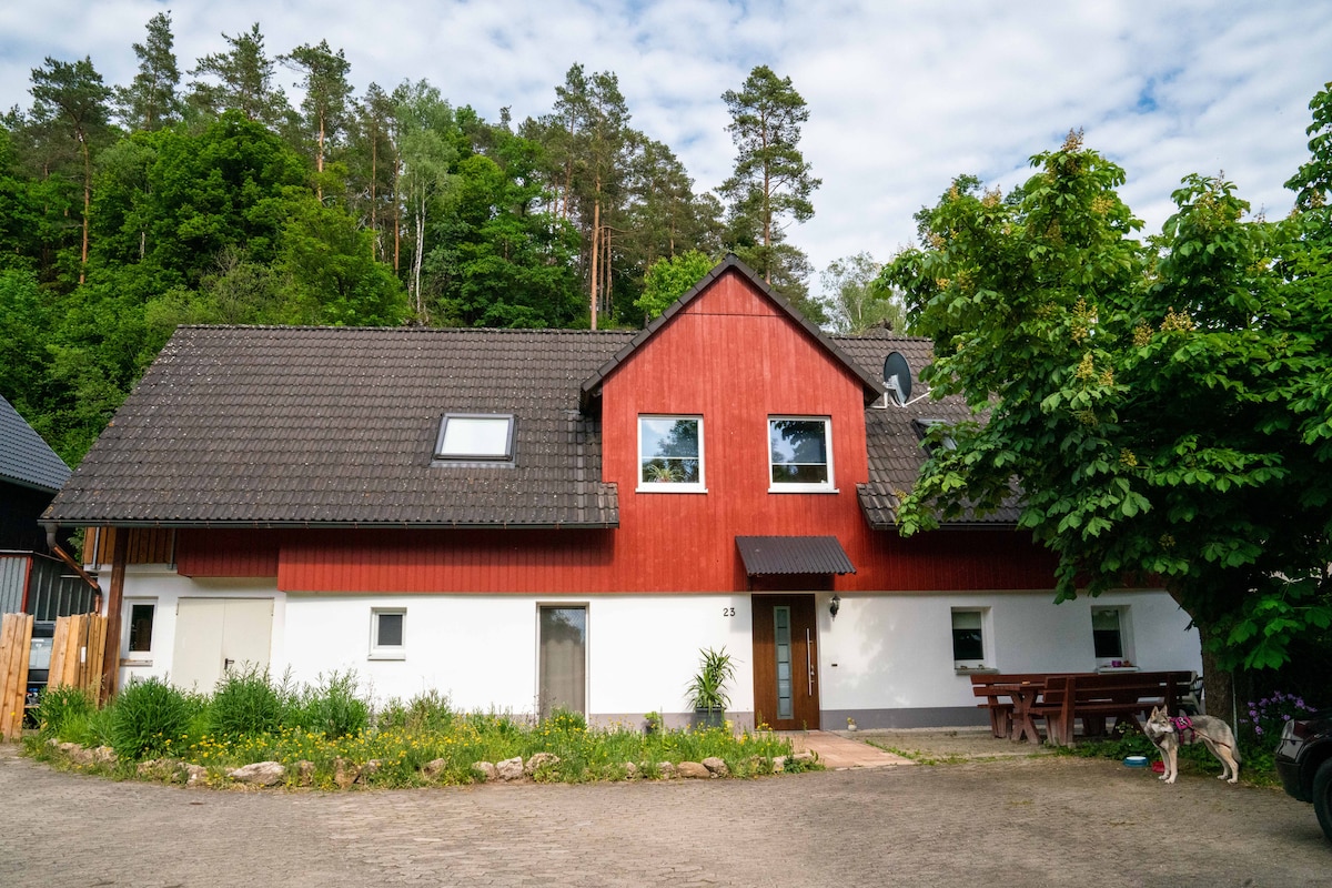 Frittliggende mølle med hus og låve ved en liten bekk ved siden av en stor lysning i nærheten av Kronach. I løpet av de siste tre årene har den blitt nøye renovert, utelukkende innredet med gamle møbler, og den bøhmiske krysshvelvstallen er omgjort til et 80 kvm stort kjøkken. Brødovn, kassevindu, sentralvarme. Uendelige mengder sommerfugler, ildfluer, svartstork ... Sammen med det nyrenoverte huset rett ved siden av, er det plass til over 22 personer.