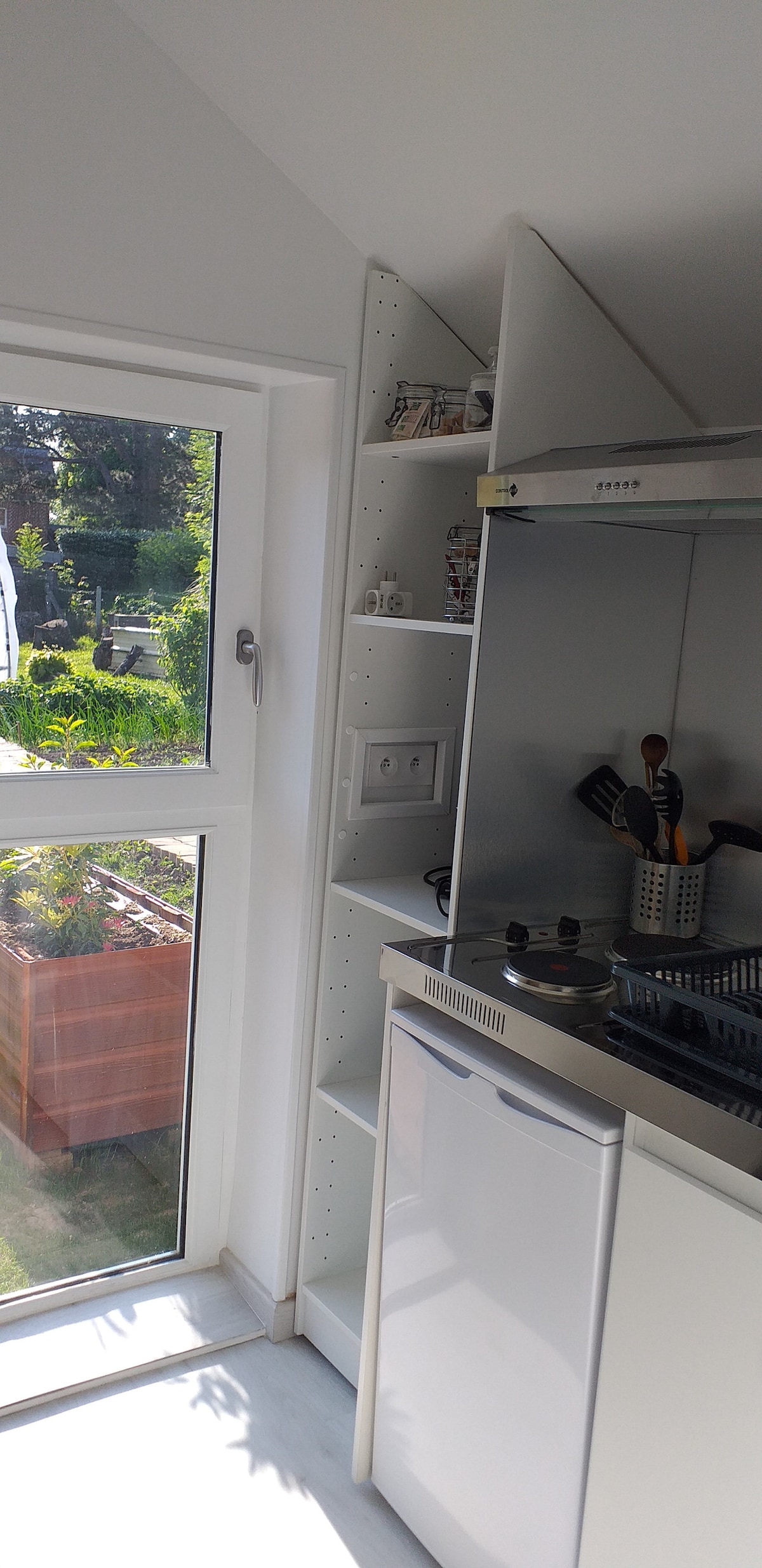 I nærheten av McArthurGlen Paris-Giverny; Giverny (åpent apr-okt), Roche Guyon, Château Gaillard, rolig og grønn ramme, hytte utstyrt med et soverom med dobbeltseng (og en madrass på gulvet), dusj og toalett + utstyrt kjøkken (kjøleskap, ovn, mikrobølgeovn, oppvask), ideelt for familie (par med 1 barn). Turgåing / sykling. Ligger 1 time fra Paris (tilgjengelig med tog via Vernon, deretter Uber/bilutleie, 10 minutter - må bestilles på forhånd). Felles tilgang til parkering og anlagt hage.