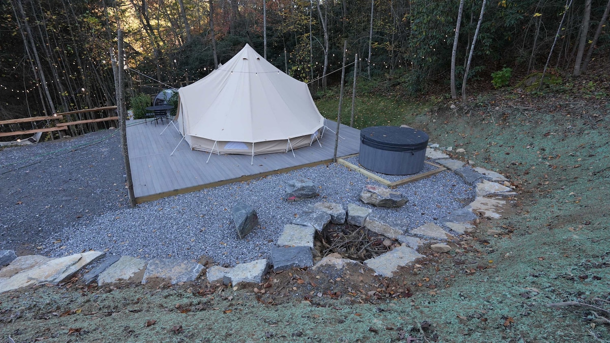 Opplev naturen med stil i et rustikt glampingtelt på Wilderness Cove Campground. Disse glampingteltene ligger i de pittoreske fjellene i Saluda i Nord-Carolina, og er perfekte for naturelskere som ønsker å unnslippe byens mas. Med en komfortabel queensize-seng, koselige møbler, privat overbygd terrasse og utendørs bålplass har du alt du trenger for å slappe av i naturen.