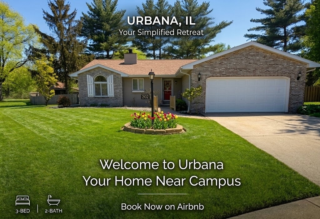 Unn deg et sjarmerende Urbana-feriested – bare 5 minutters gange til UIUC, 2 minutter til Carle Hospital og 5 minutter til sentrum. Gjemt i et rolig nabolag, men likevel noen skritt fra kafeer, restauranter, yogastudioer, parker, dagligvarebutikker og bussholdeplassen. Perfekt for jobb, velvære eller en koselig ferie. Dette moderne oppholdet er designet for filmkvelder (massiv 85" TV), matlagingsdatoer (designerkjøkken) og avslappende søvn, og tilbyr komfort, bekvemmelighet og et snev av magi – alt i gangavstand til alt du trenger.