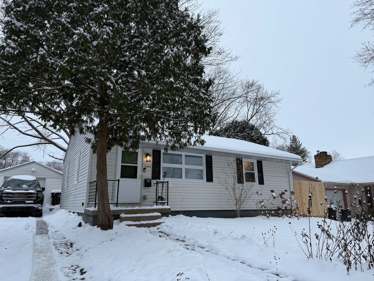 Vår bungalow med to soverom i sentrum av Urbana med 1 GB Wi-Fi er nyoppusset + perfekt for familier, par og langvarige reisende som ønsker å være i nærheten av hjertet av det hele med en Superhost tilgjengelig. Stor bakgård med bålplass også! Bekvemmelig plassert kvartaler fra Urbana sentrum, er det et koselig og praktisk sted når du besøker University of Illinois, sjekker ut en festival eller bare har litt tid borte. Vi ligger fem minutters gange fra sentrum og åtte minutter med bil til UIUCs campus.